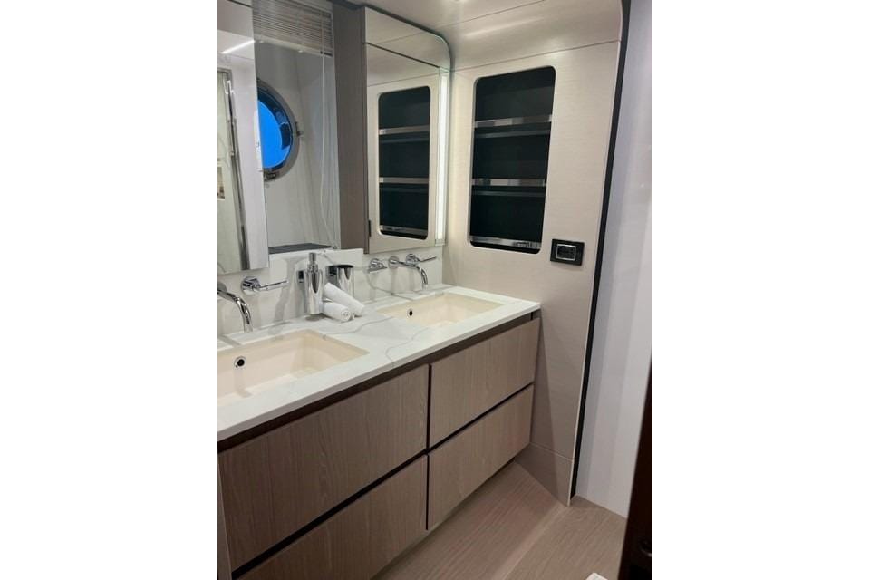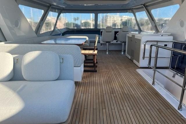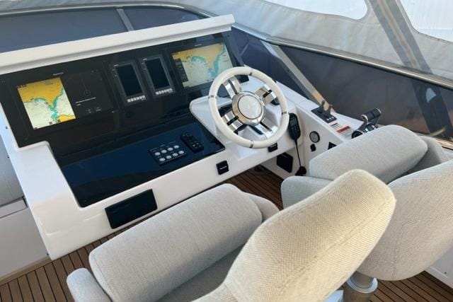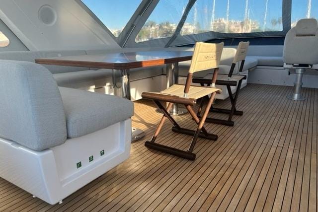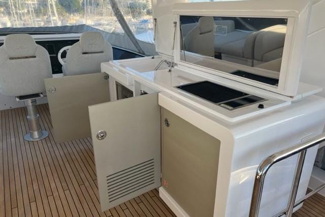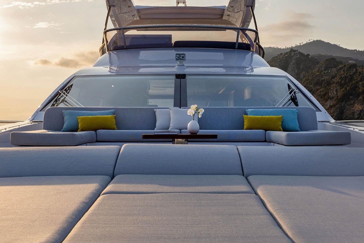 This 72 Flybridge stands out for its exceptional specification and meticulous maintenance. She features a striking grey blue hull, full teak decks and walkways, and one of the largest flybridge areas available on a 72-foot yacht - complete with a fully equipped Boffi galley, BBQ, dining for 8-10 guests, and a dedicated helm station.