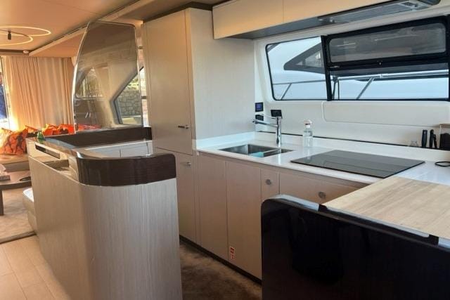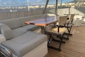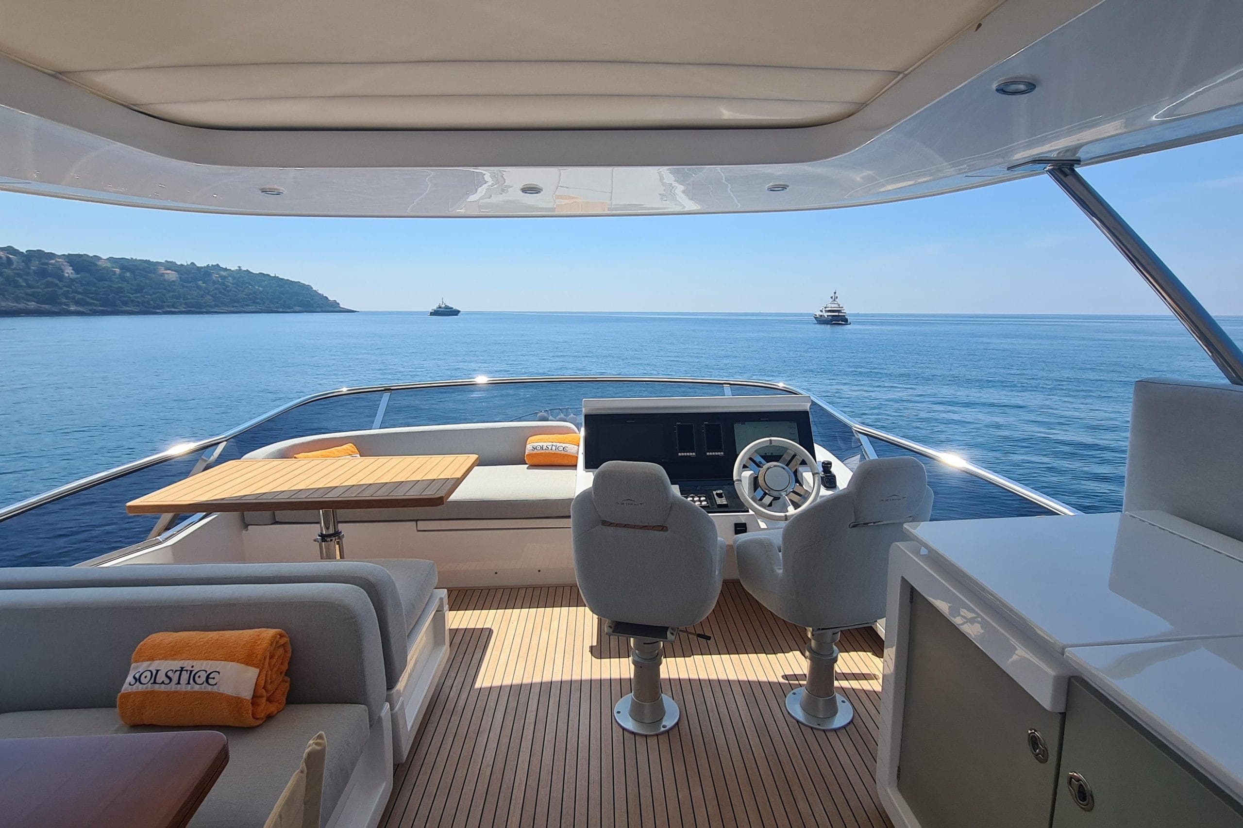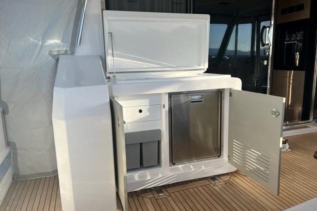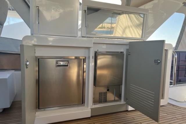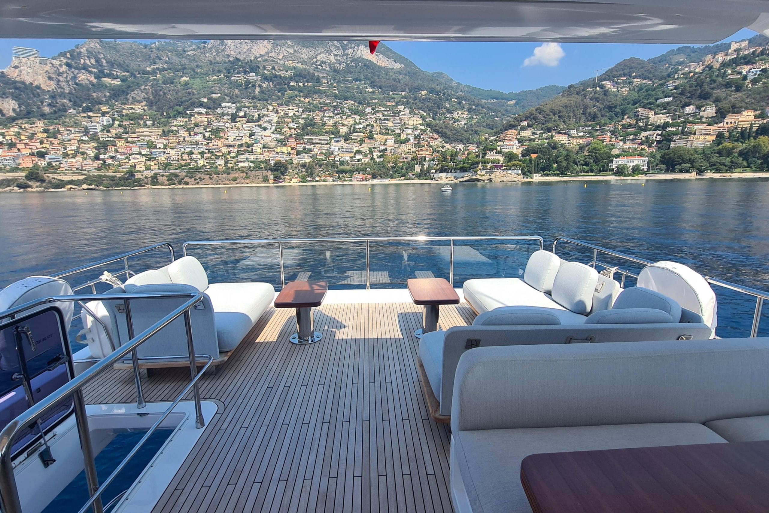 This 72 Flybridge stands out for its exceptional specification and meticulous maintenance. She features a striking grey blue hull, full teak decks and walkways, and one of the largest flybridge areas available on a 72-foot yacht - complete with a fully equipped Boffi galley, BBQ, dining for 8-10 guests, and a dedicated helm station.