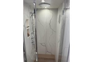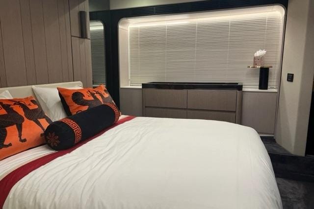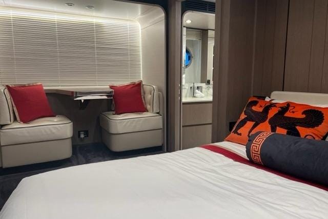Below deck, four ensuite cabins accommodate up to eight guests, with the amidships master suite offering a king-size bed, dressing area, and large TV concealed behind a mirror. Each cabin has been individually styled with personal touches throughout.