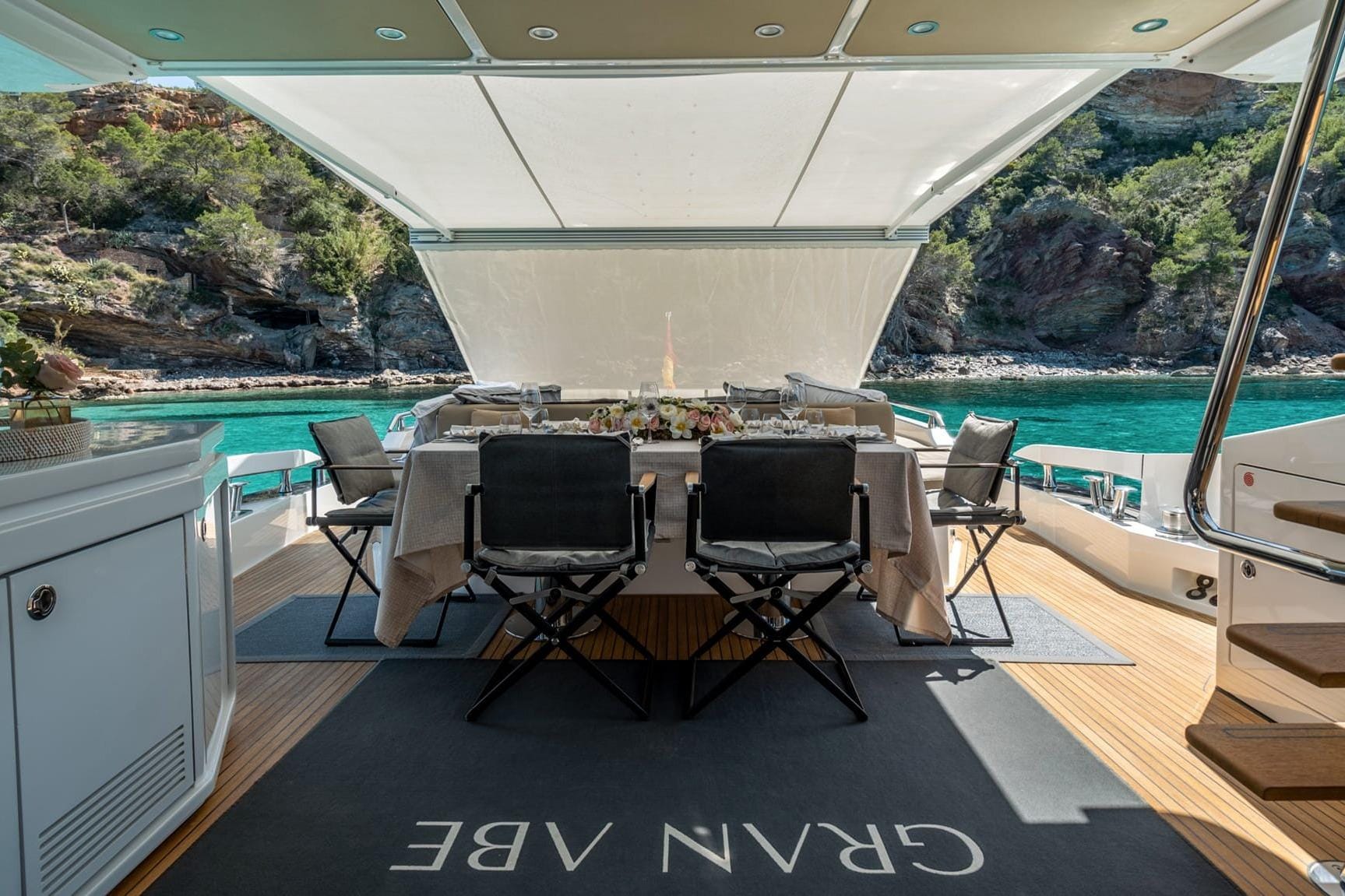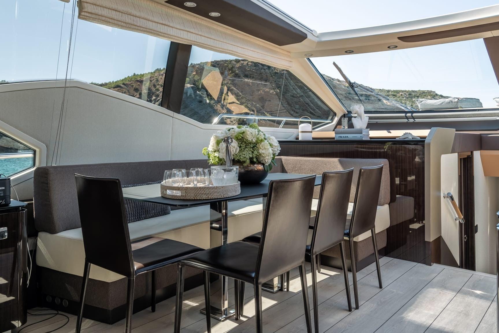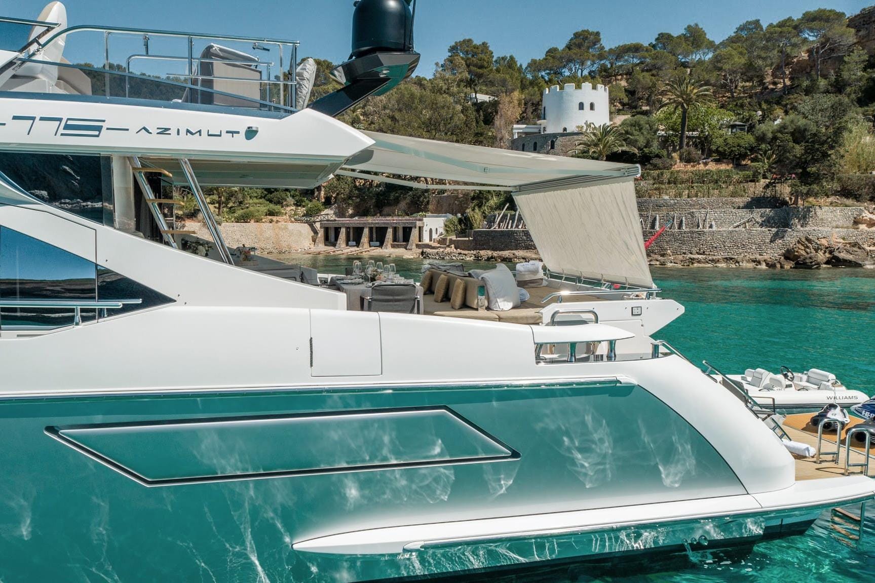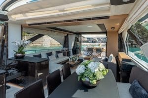 Exterior FeaturesThe Azimut 77S features spacious sunbathing areas at the bow, stern, and flybridge. Its garage door opens hydraulically, creating a generous "Beach Club" area equipped with reclining sun loungers, ideal for an afternoon of water sports or enjoying an evening cocktail. A wide range of water toys are also included.