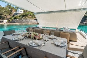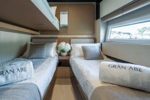 Interior FeaturesThis Azimut 77S features a modern and stylish interior, comfortably accommodating up to 9 guests in 4 en-suite cabins. The saloon is equipped with large windows that let in natural light, creating a relaxing atmosphere on the L-shaped sofa.