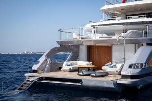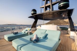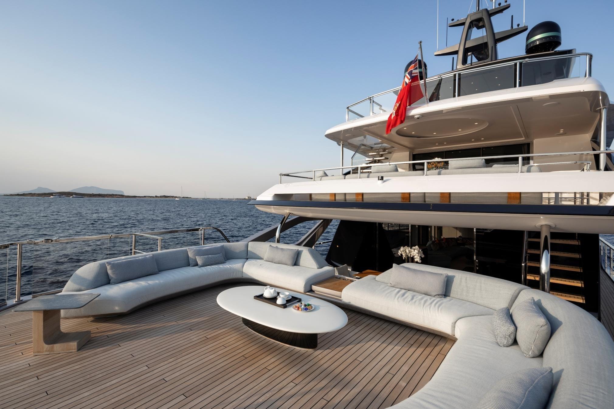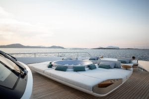 The Grande Trideck design itself is groundbreaking, offering a huge amount and variety of exterior space in addition to accommodation for up to 12 guests. With the expansive half-raised aft deck offering spectacular views over the sea while also allowing for more privacy in the traditional cockpit dining area. In addition the infinity upper deck extends from bow to stern, totally uninterrupted with a jacuzzi on the foredeck. Finally the sundeck offers the best views on board and has a fully equipped bar area.