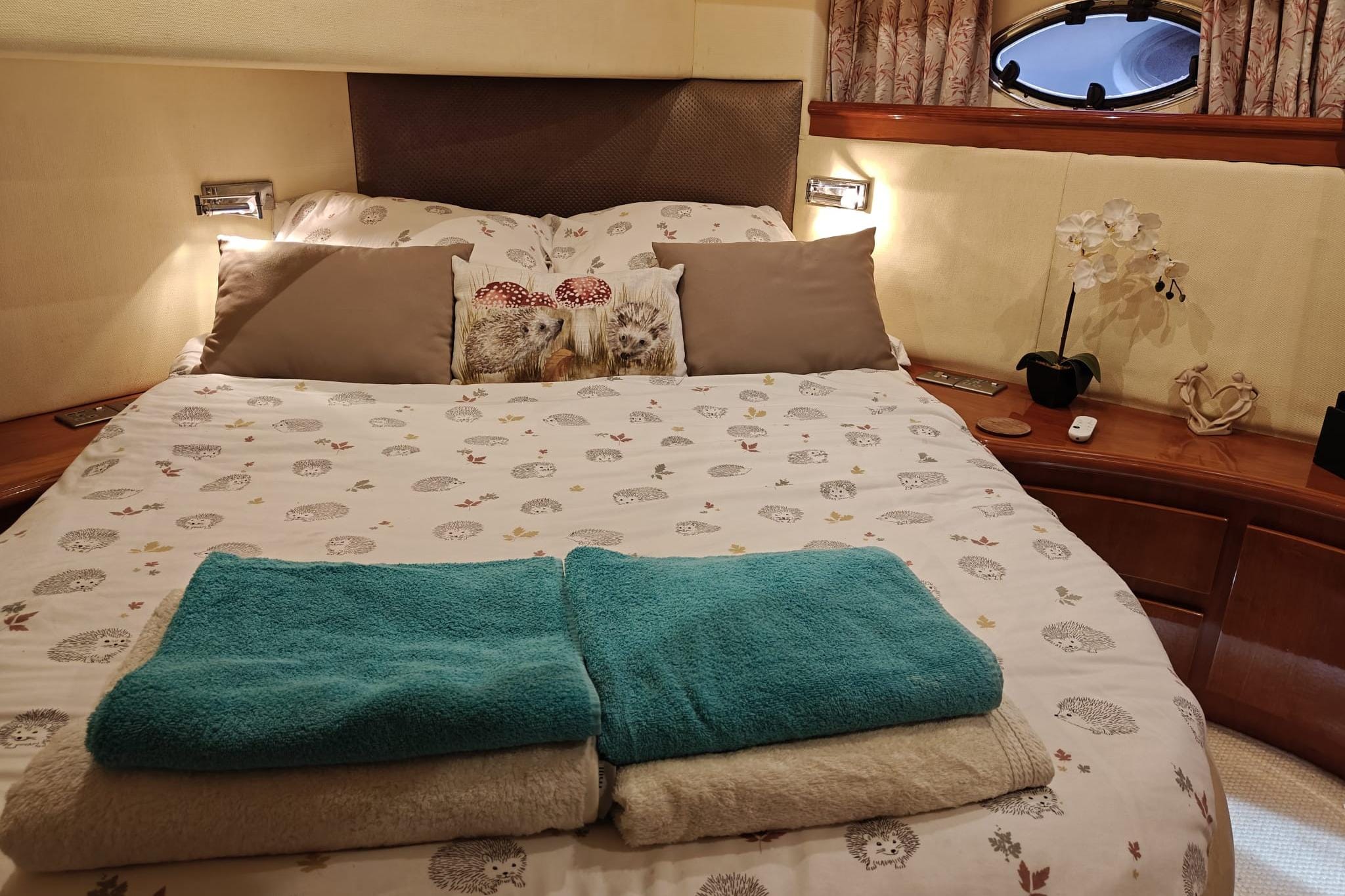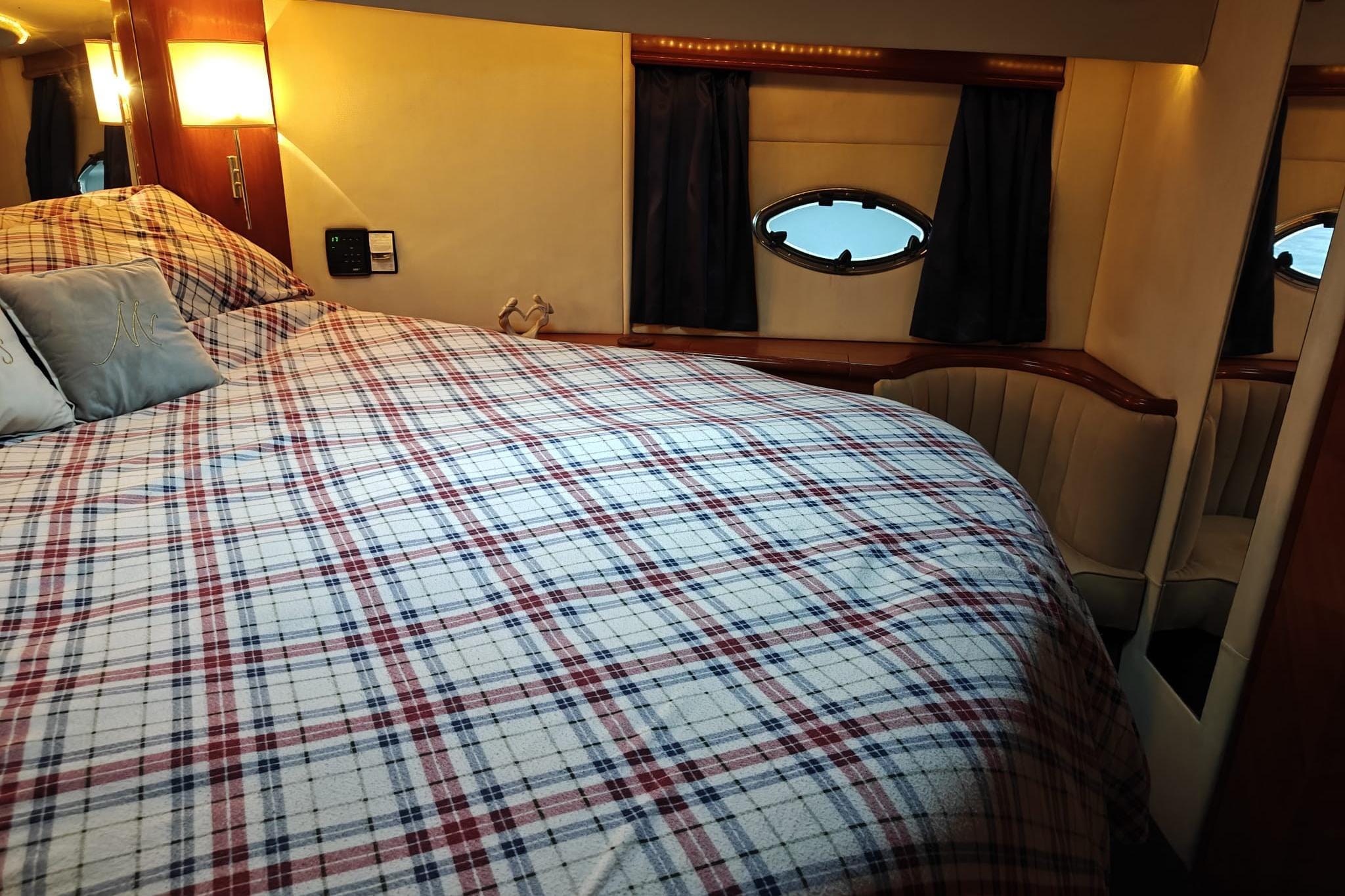 Owner's cabin forward with island bed (custom mattress replaced April 2024) and ensuite bathroom