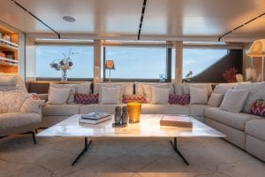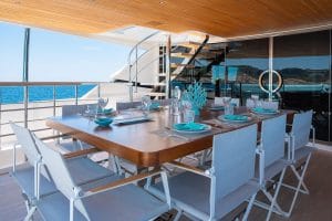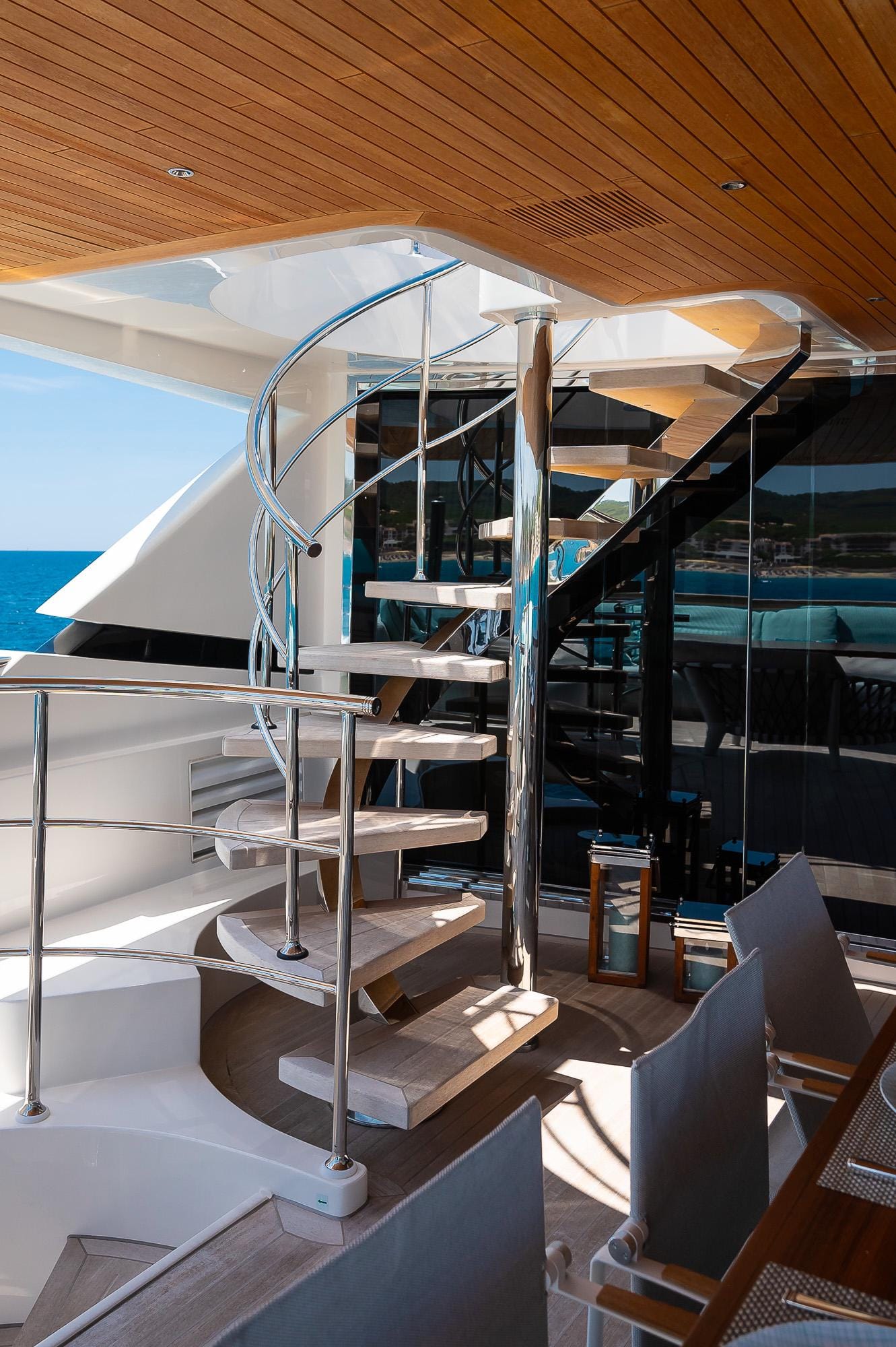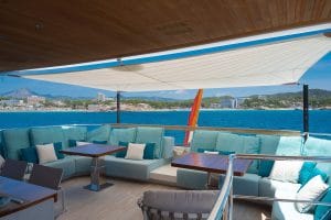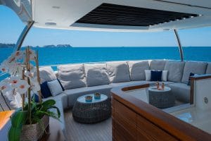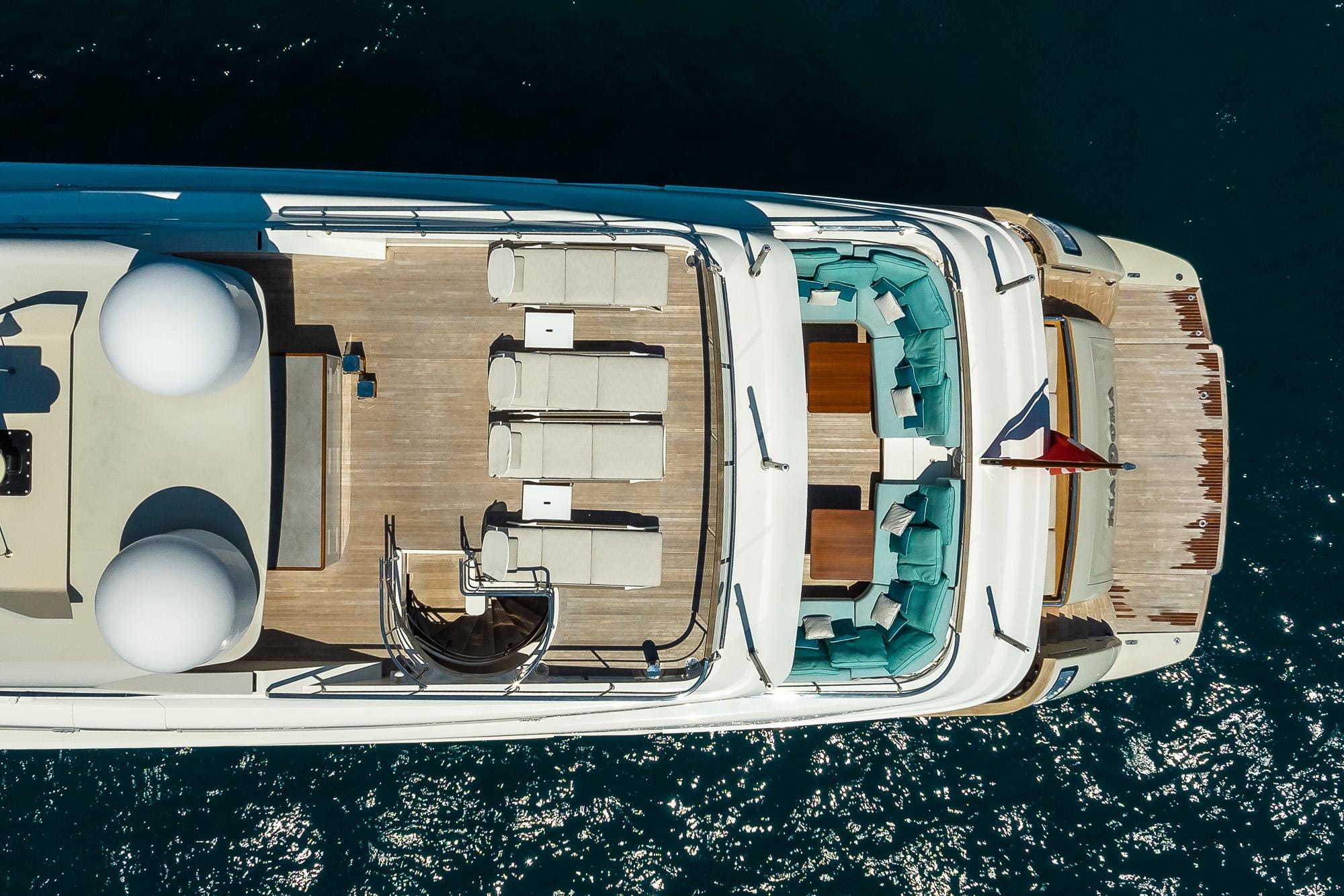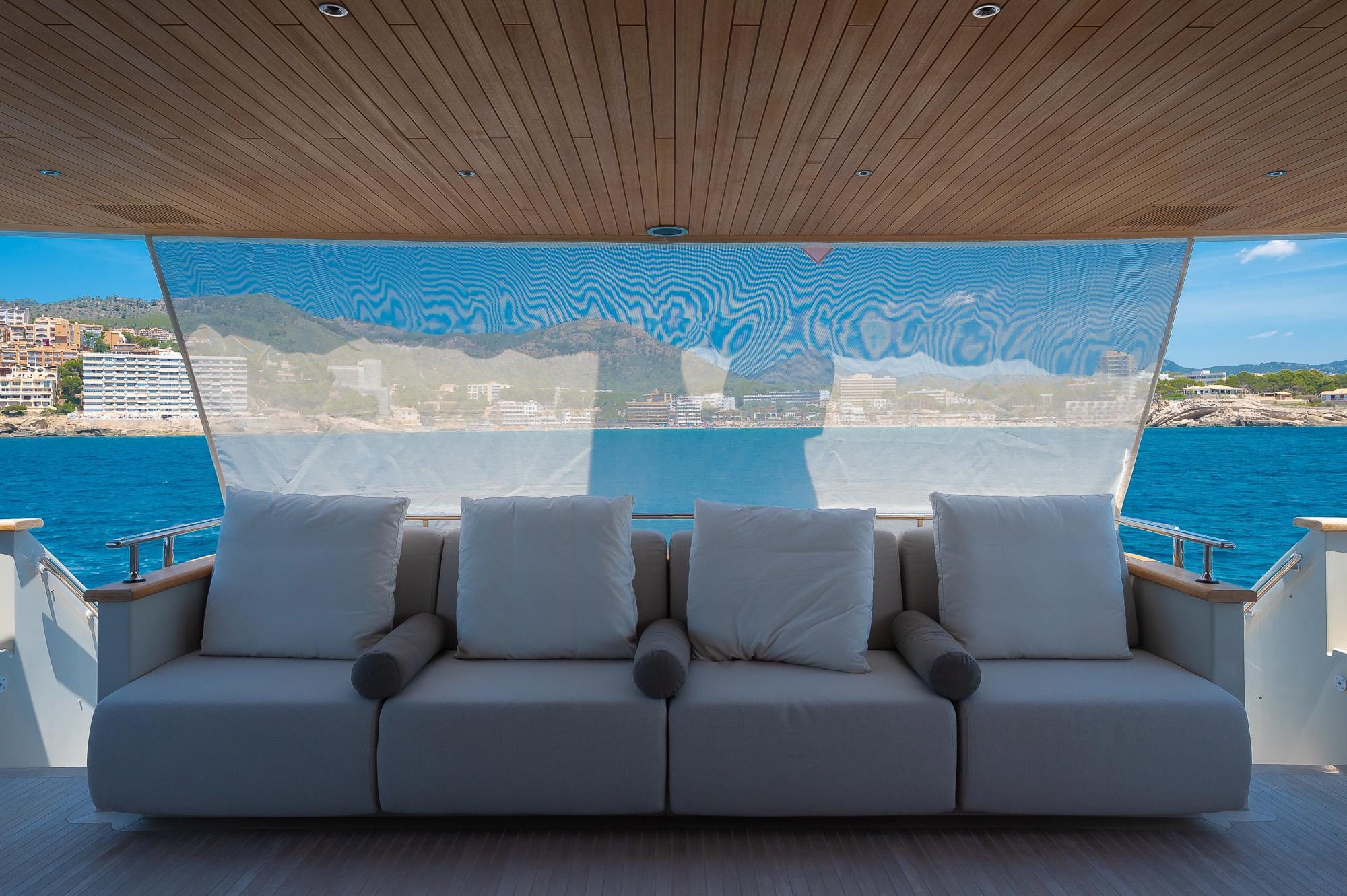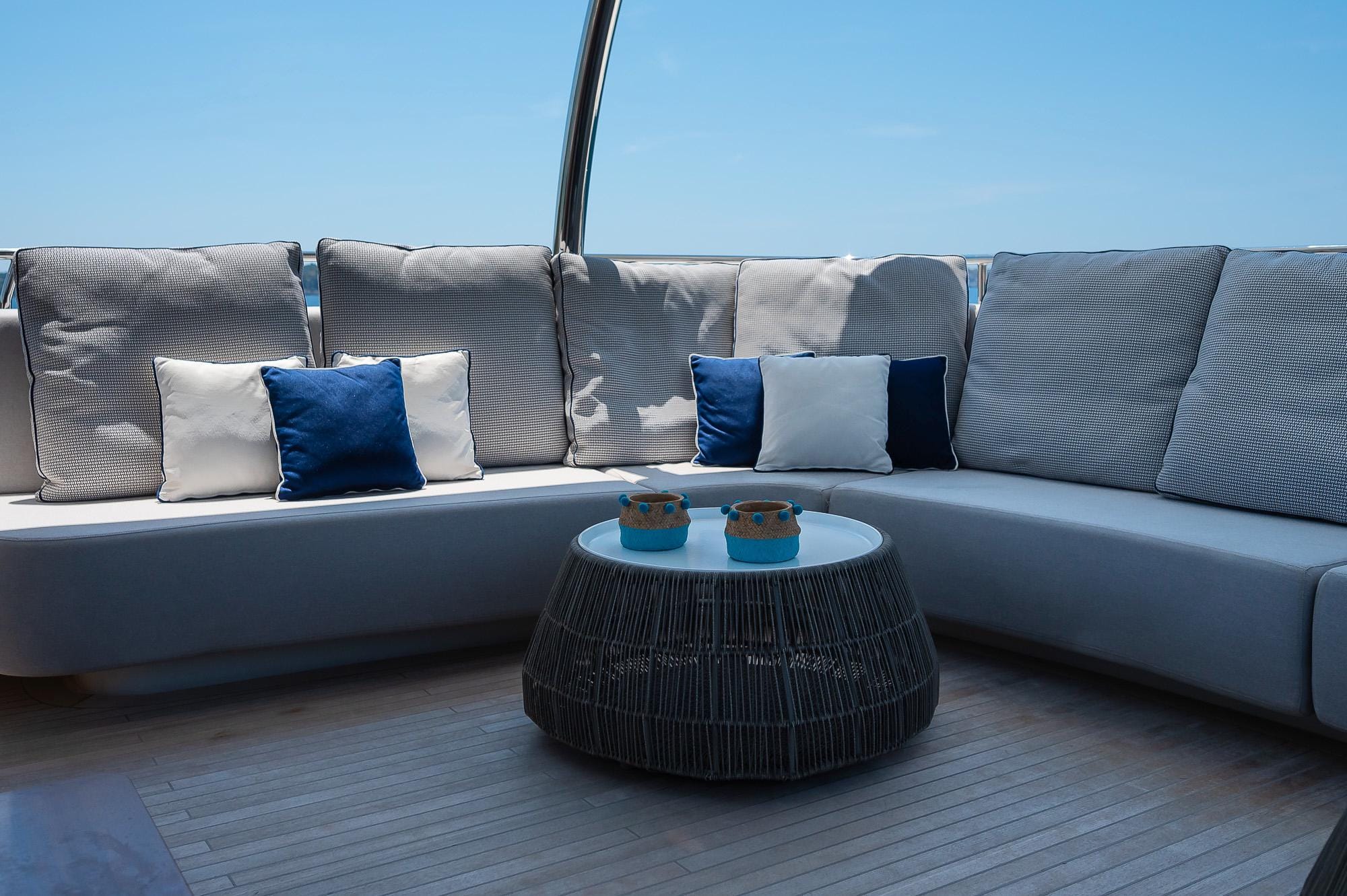 • Custom made upper deck aft cockpit sofa fixed to the floor, in teak (diff. from STD) with top insert in silestone.