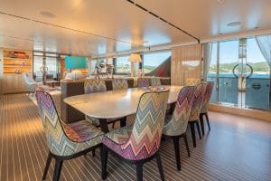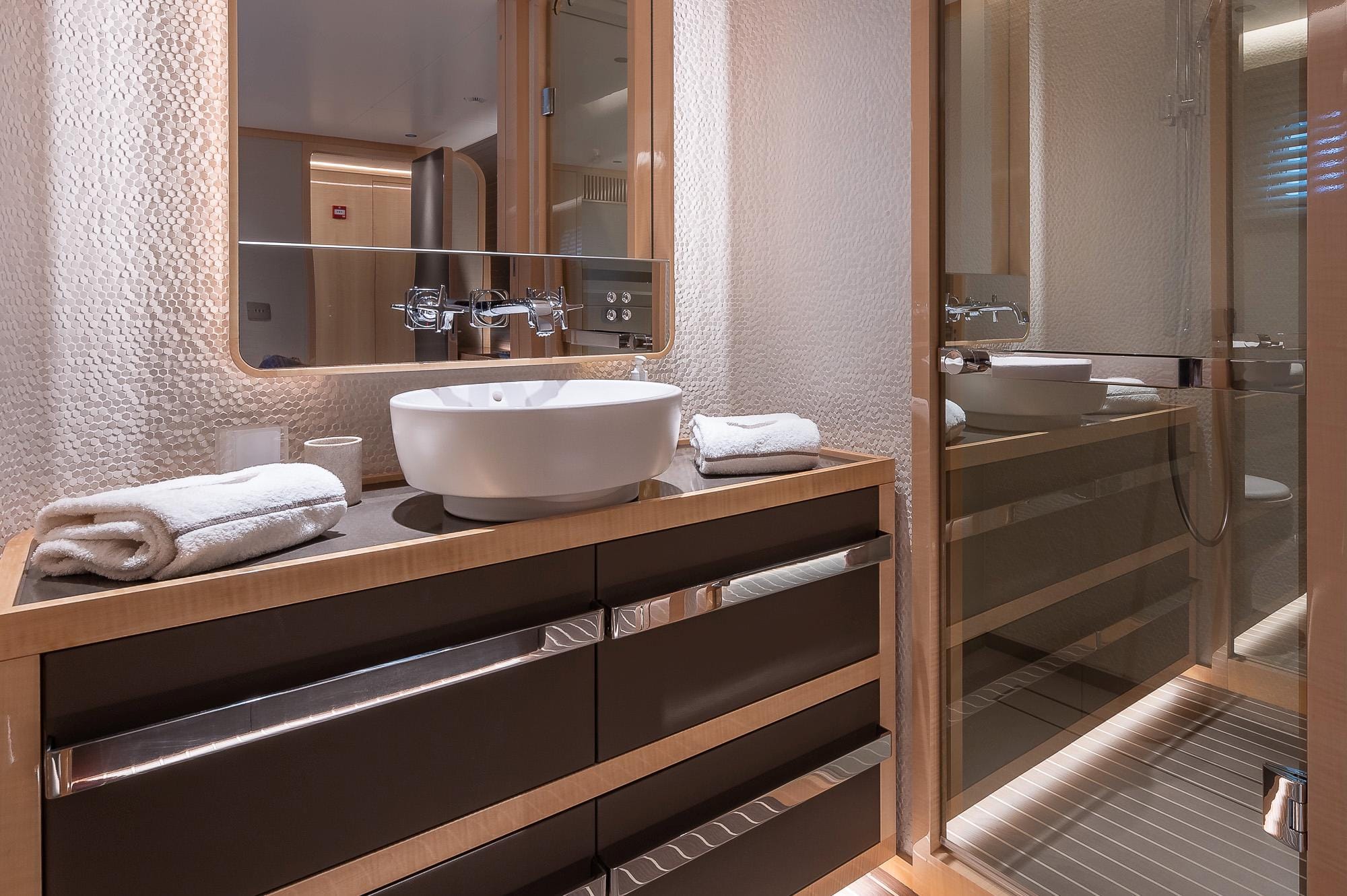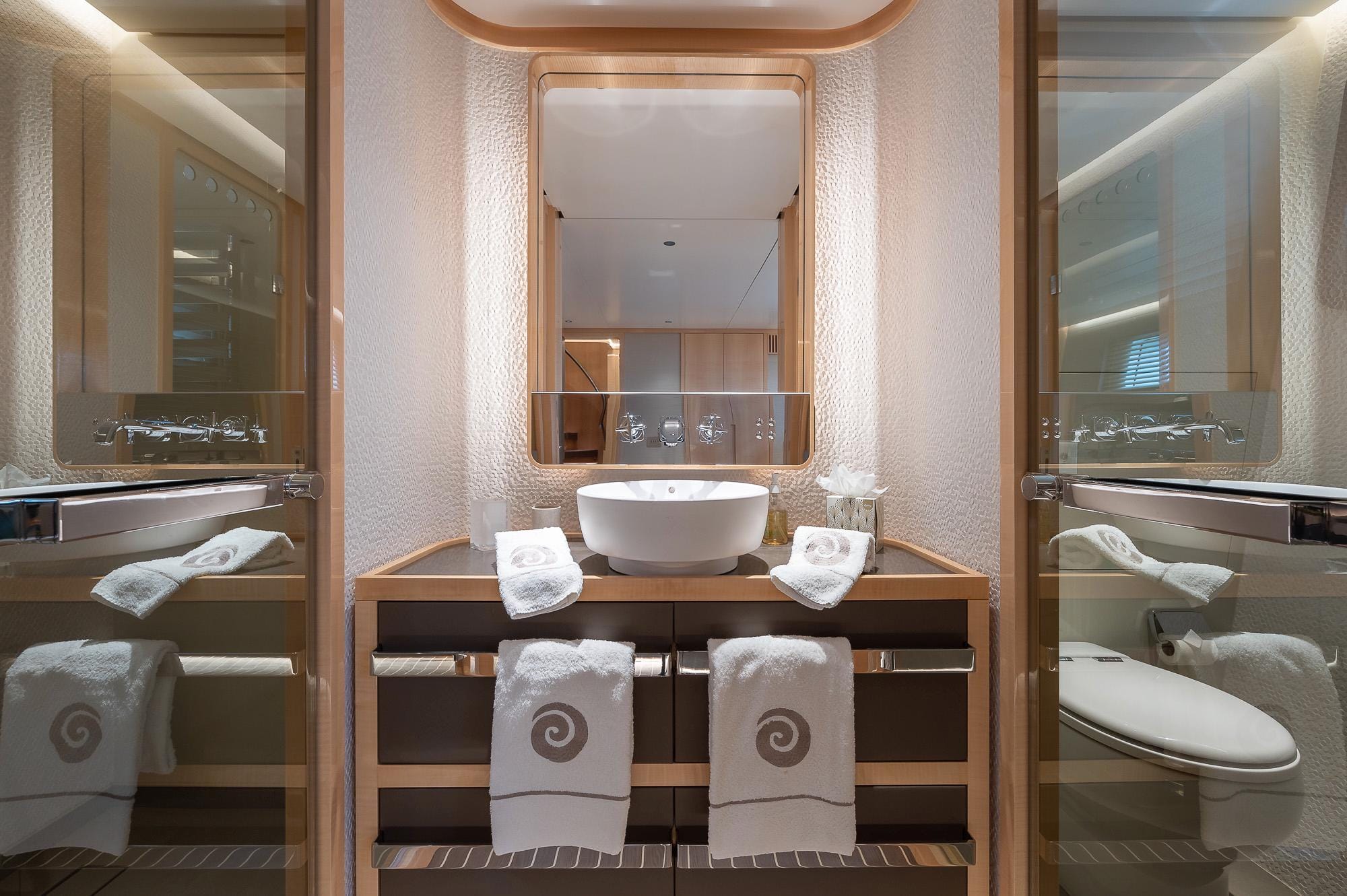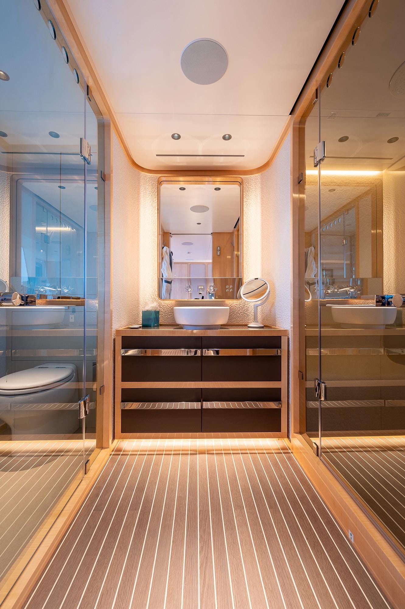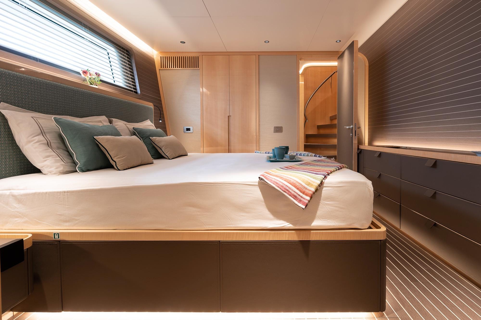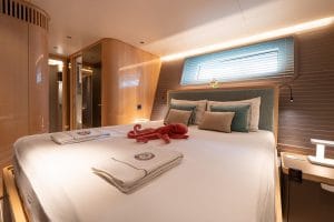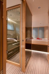 5 cabin layout with full-width master stateroom on her main deck and a further 4 double guest cabins below deck, all ensuite.