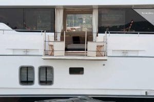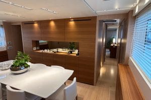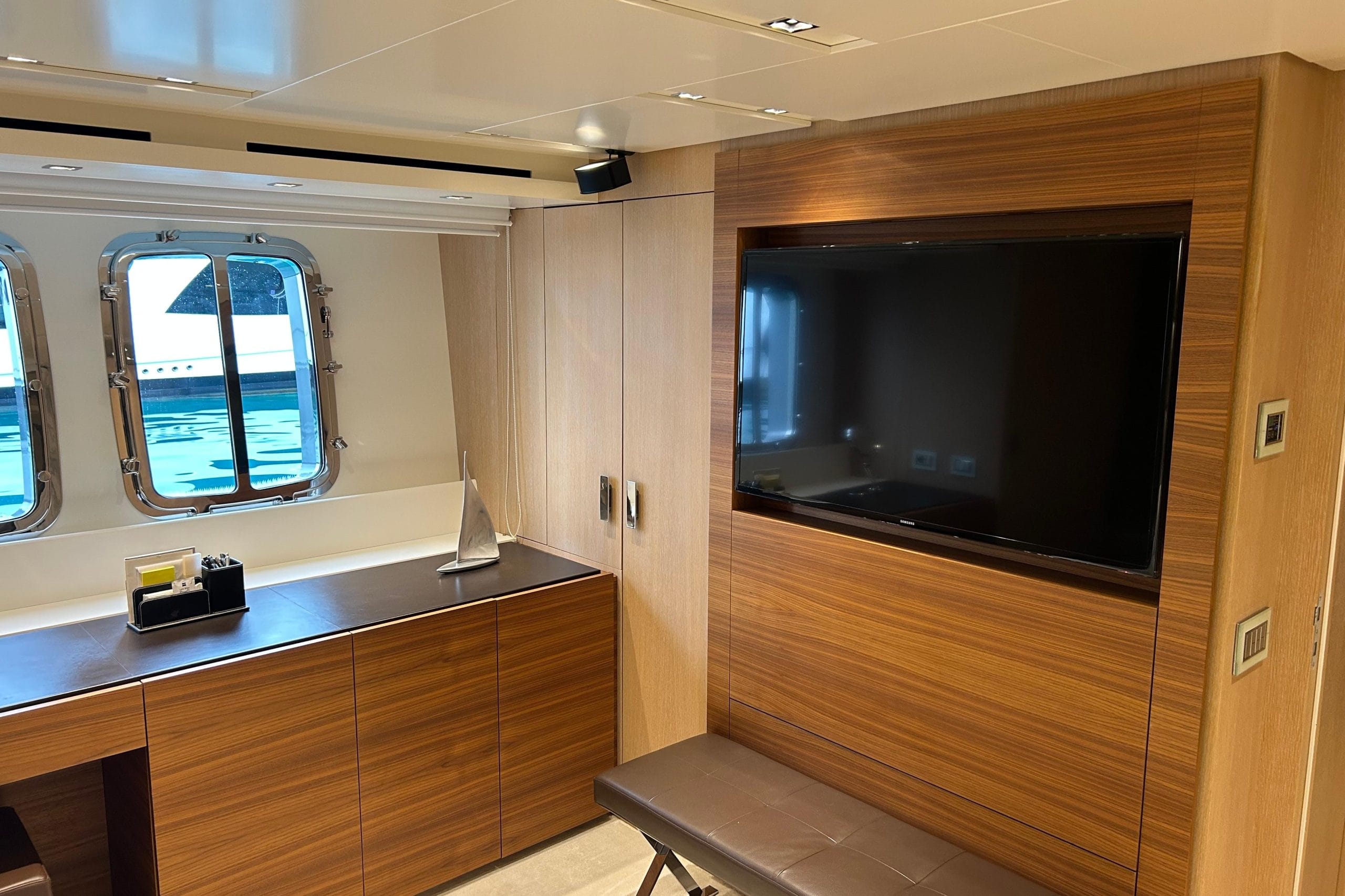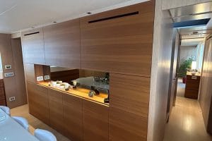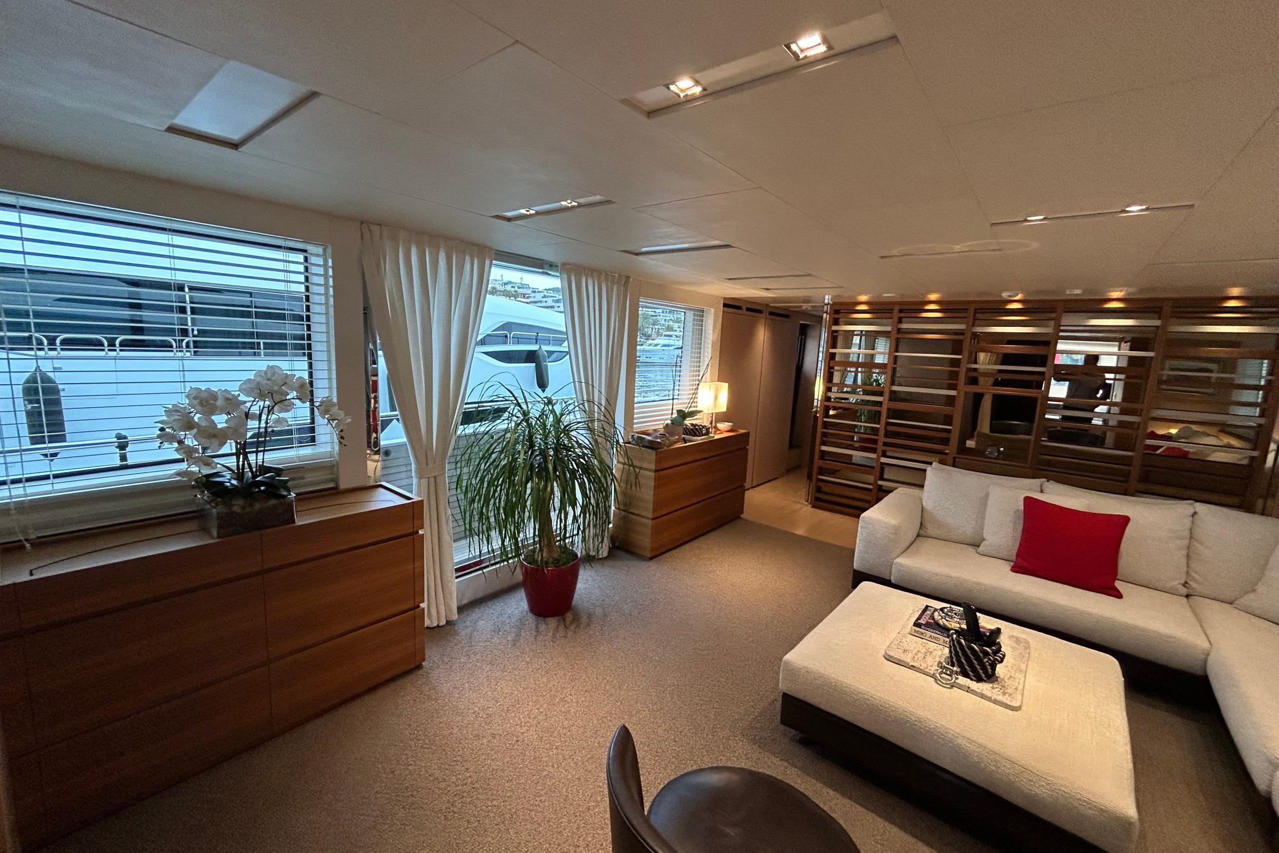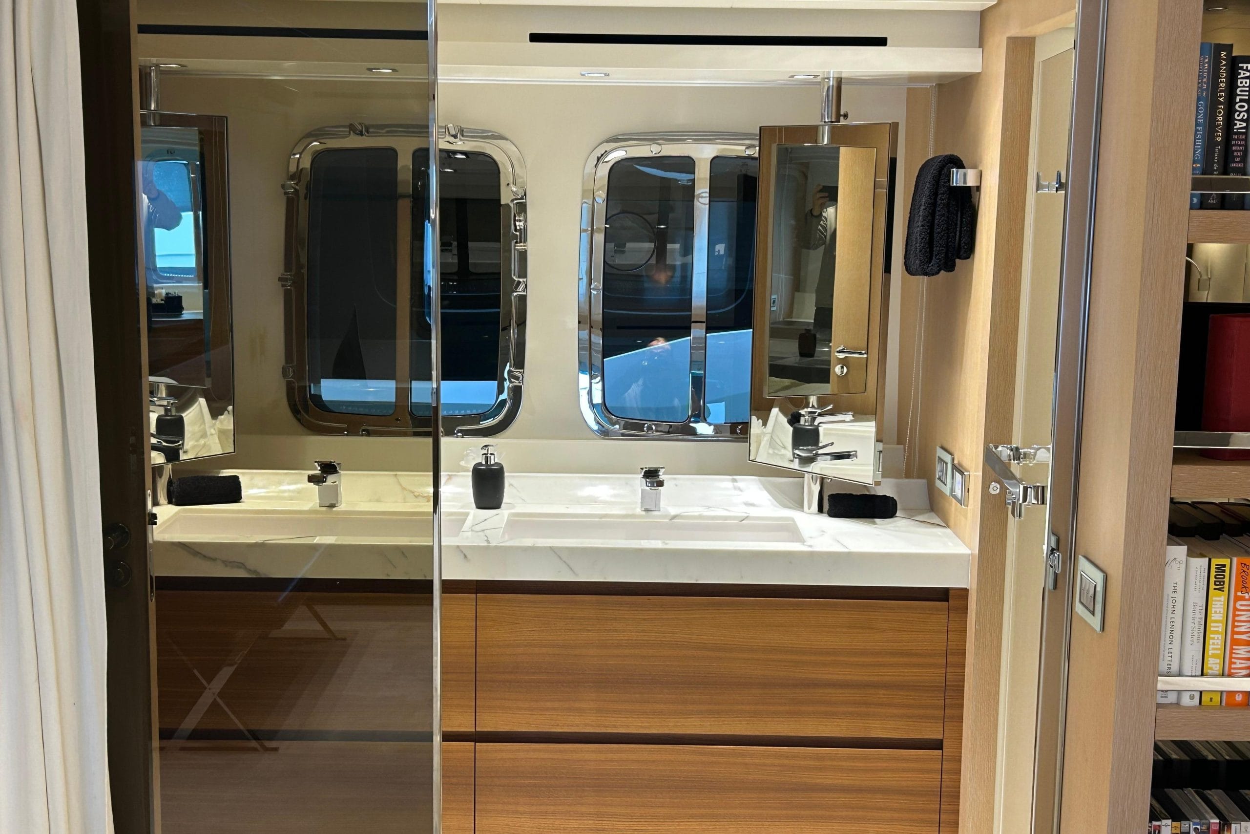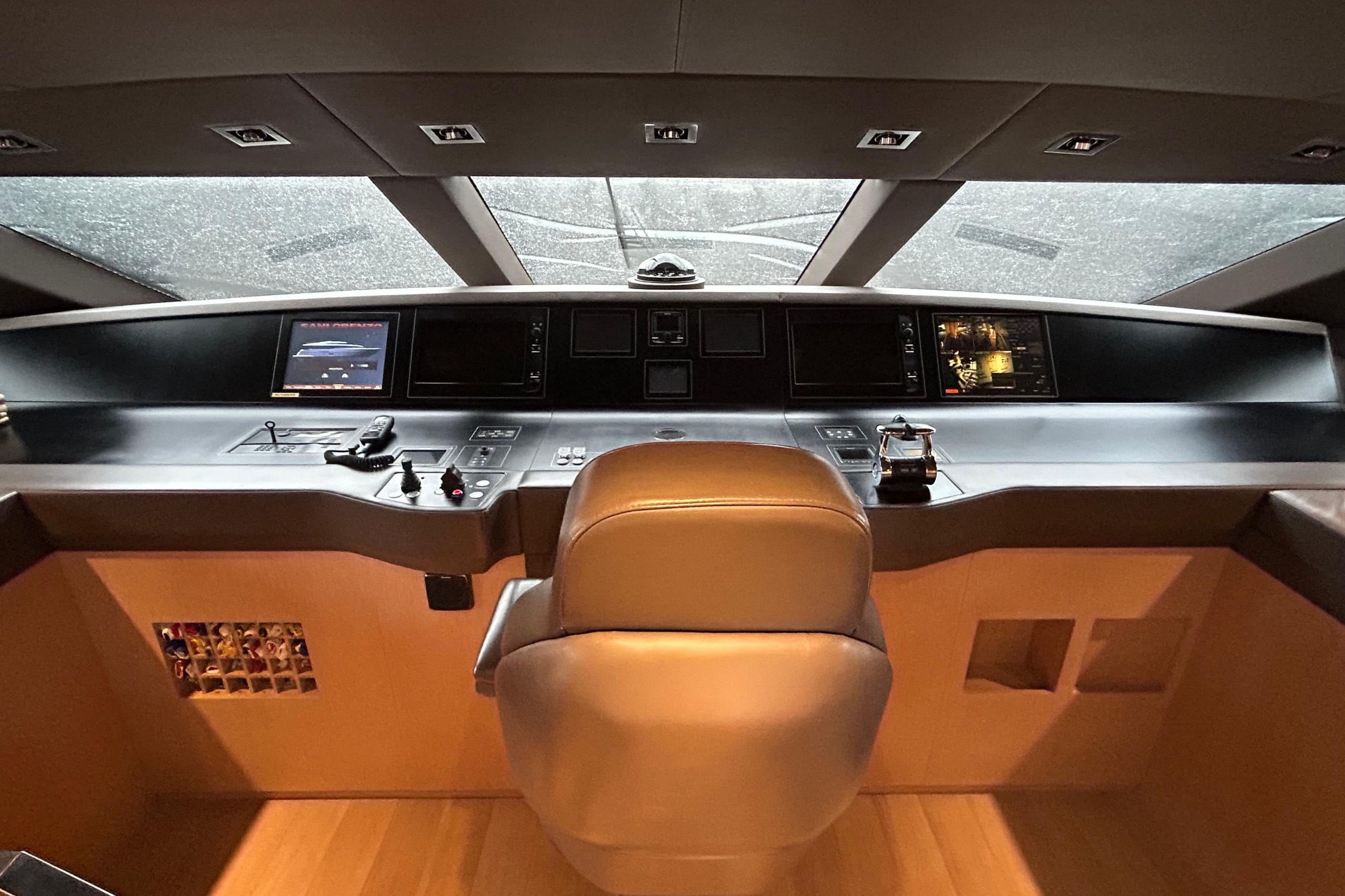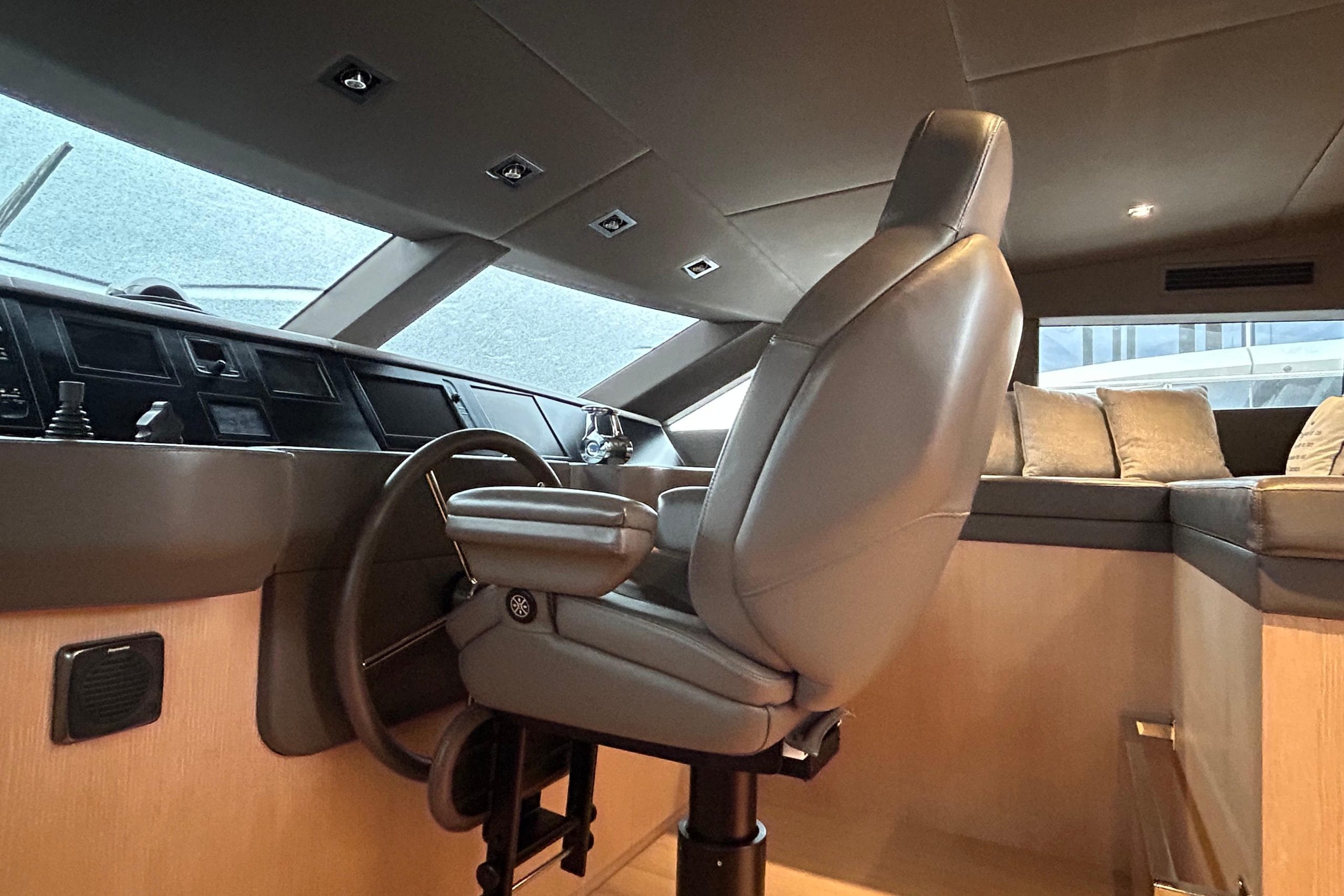 She is fully equipped to an exceptionally high level, including an opening side terrace, fully equipped Boffi flybridge galley, CMC zero-speed and underway stabilizers, and a hydraulic swim platform, delivering outstanding comfort both at anchor and underway.