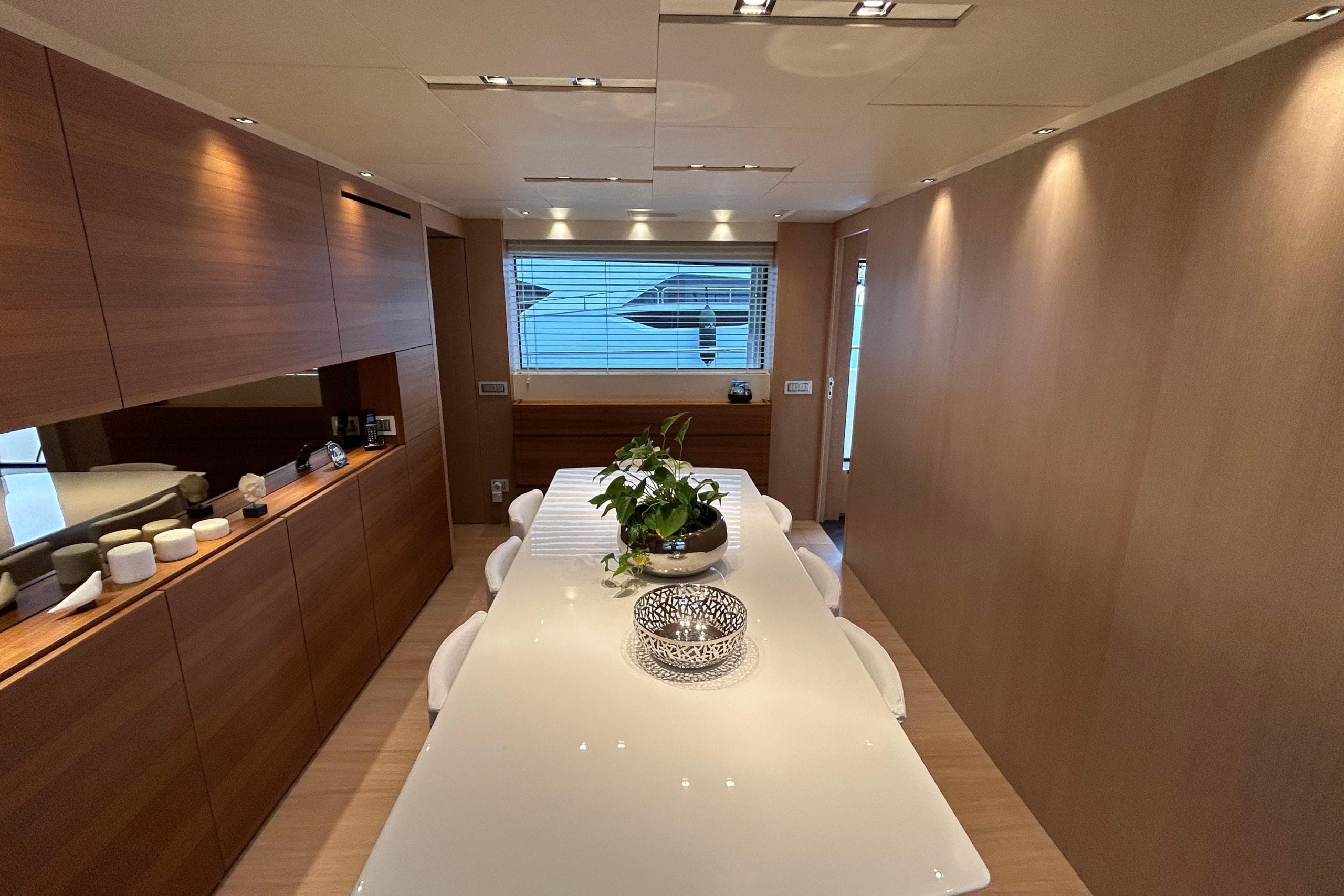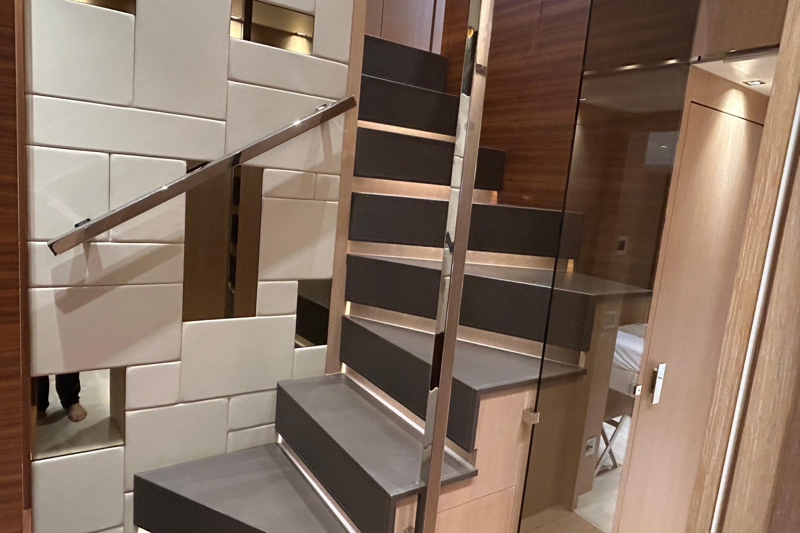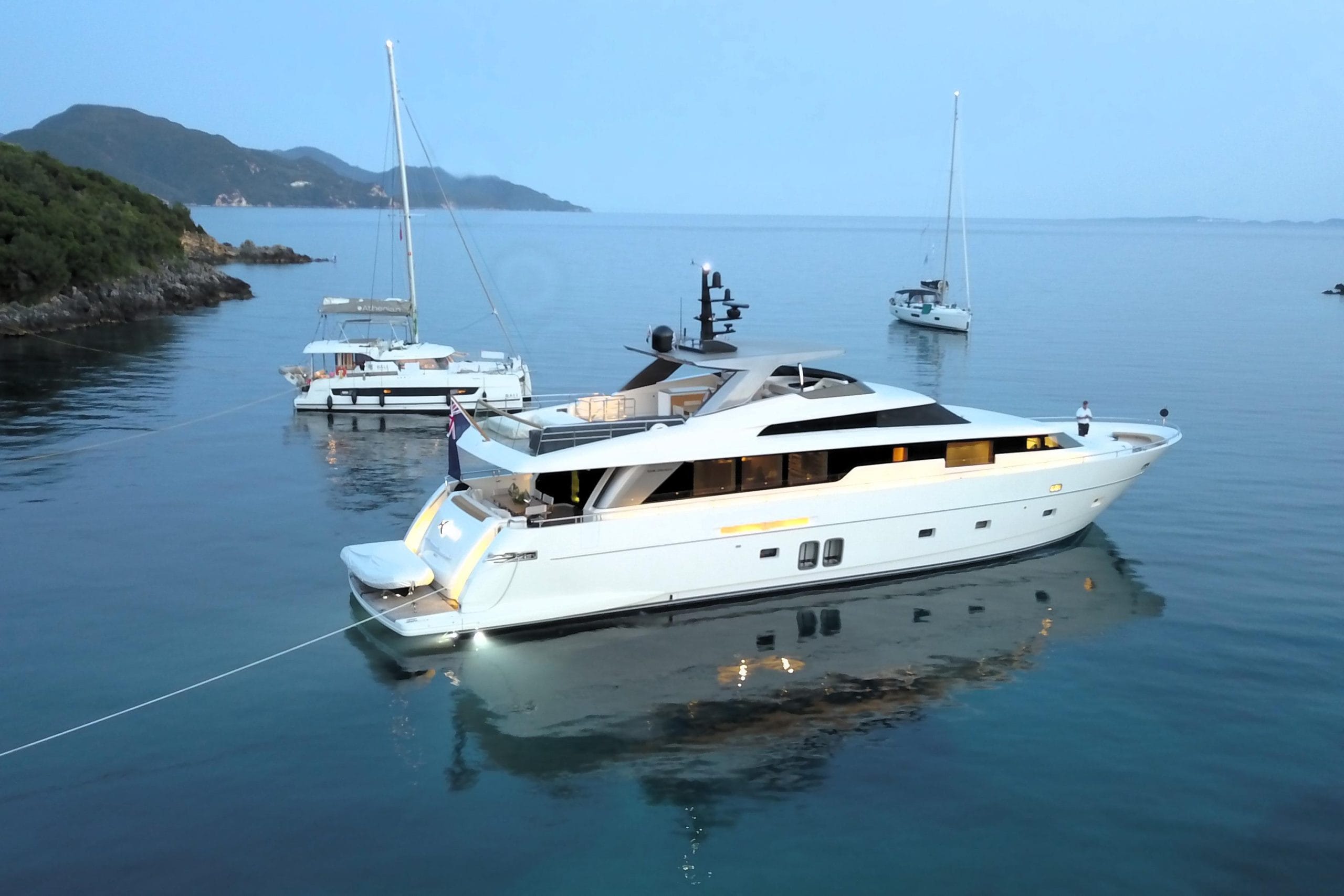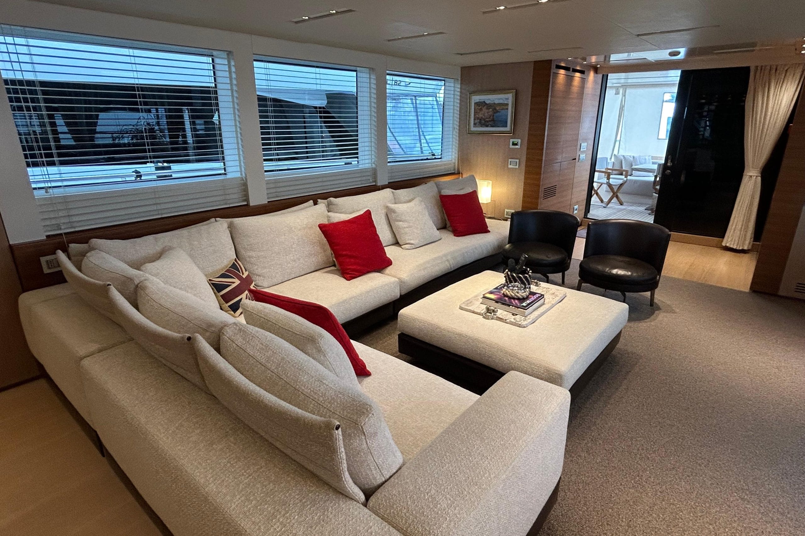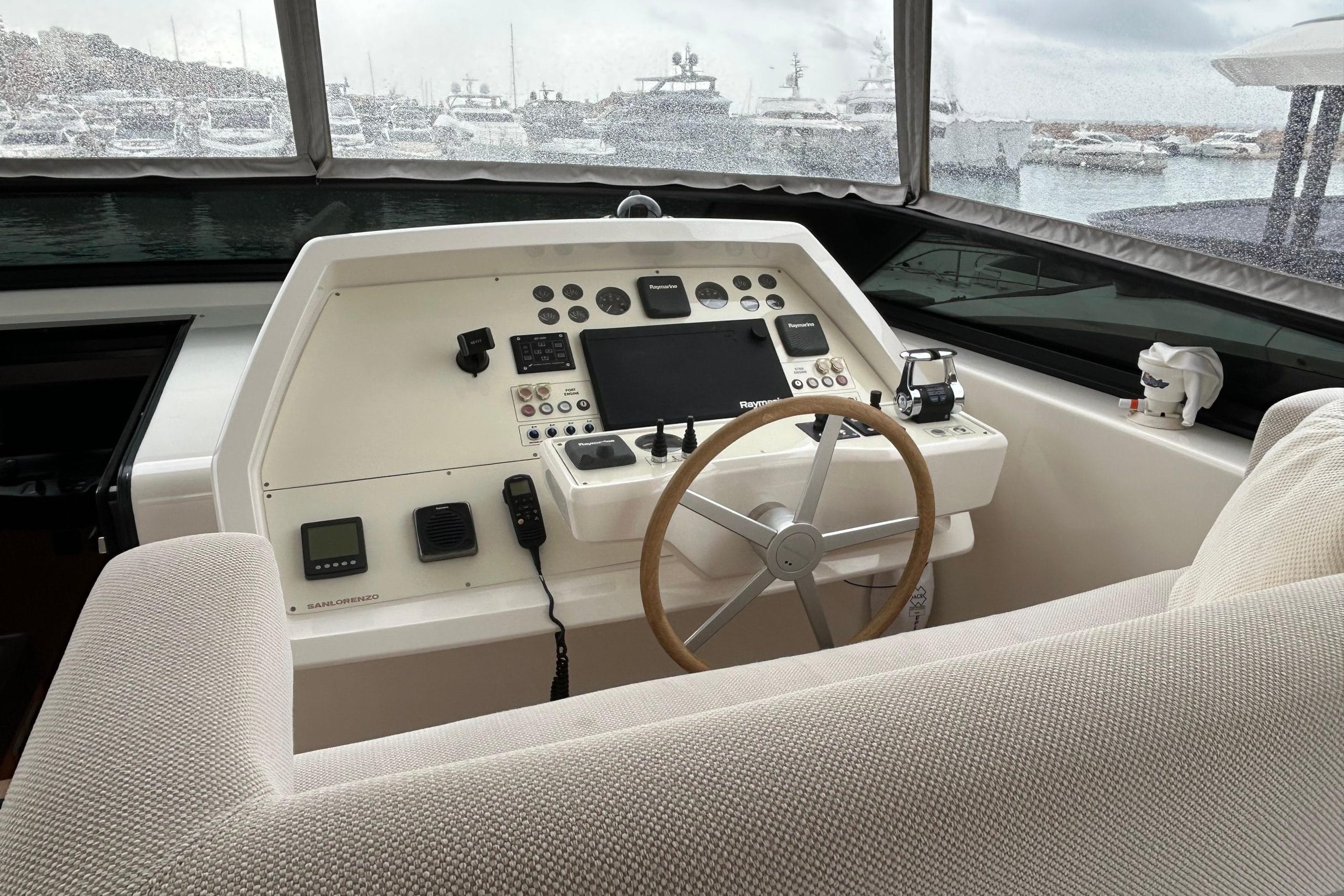 She is fully equipped to an exceptionally high level, including an opening side terrace, fully equipped Boffi flybridge galley, CMC zero-speed and underway stabilizers, and a hydraulic swim platform, delivering outstanding comfort both at anchor and underway.