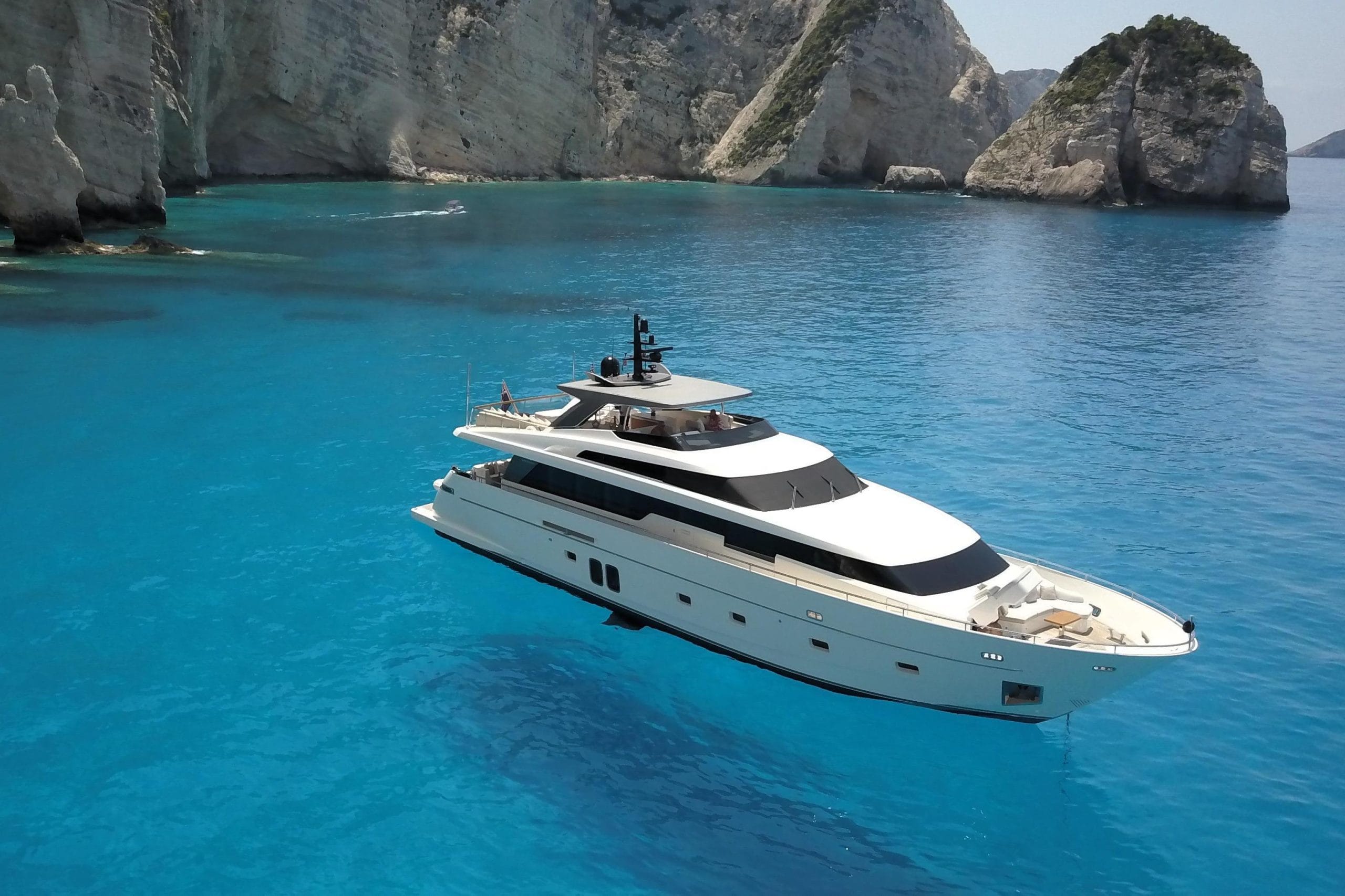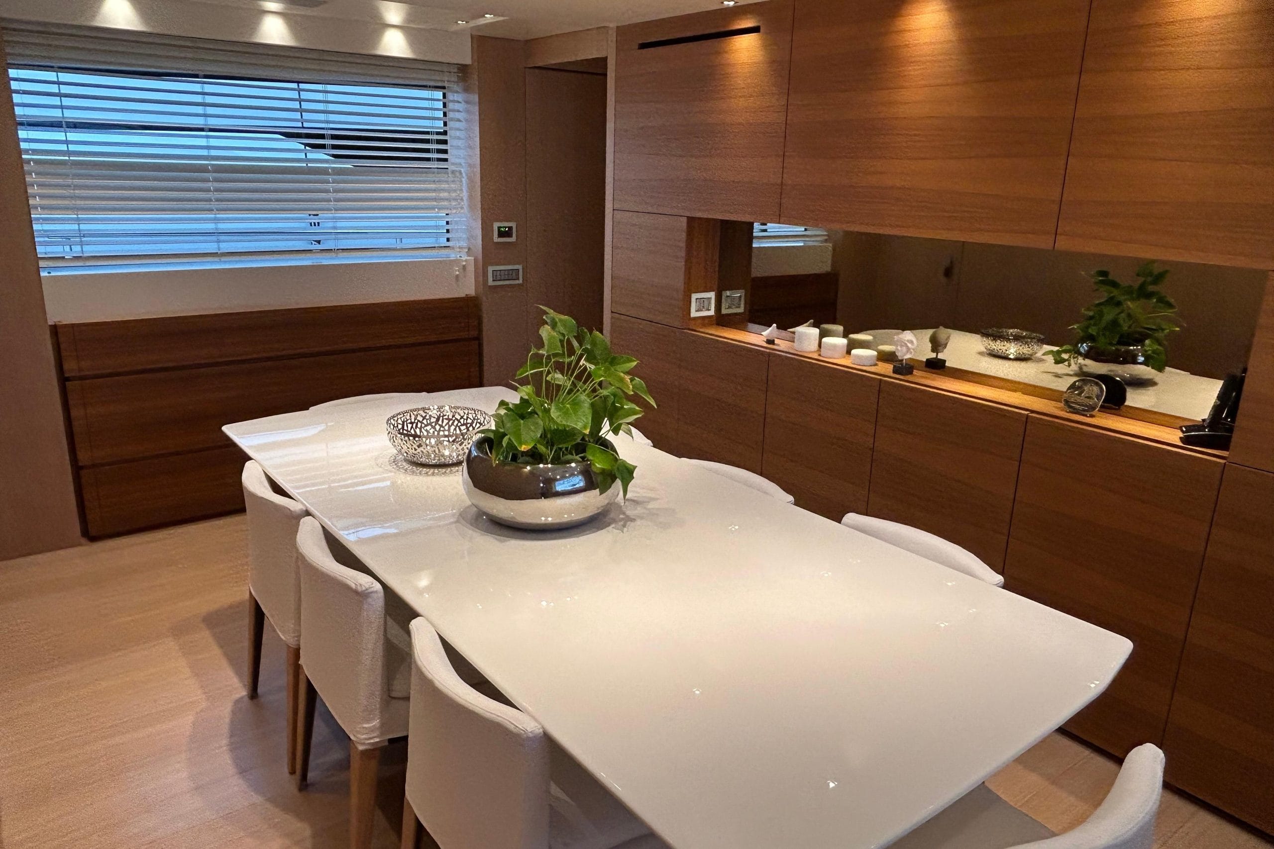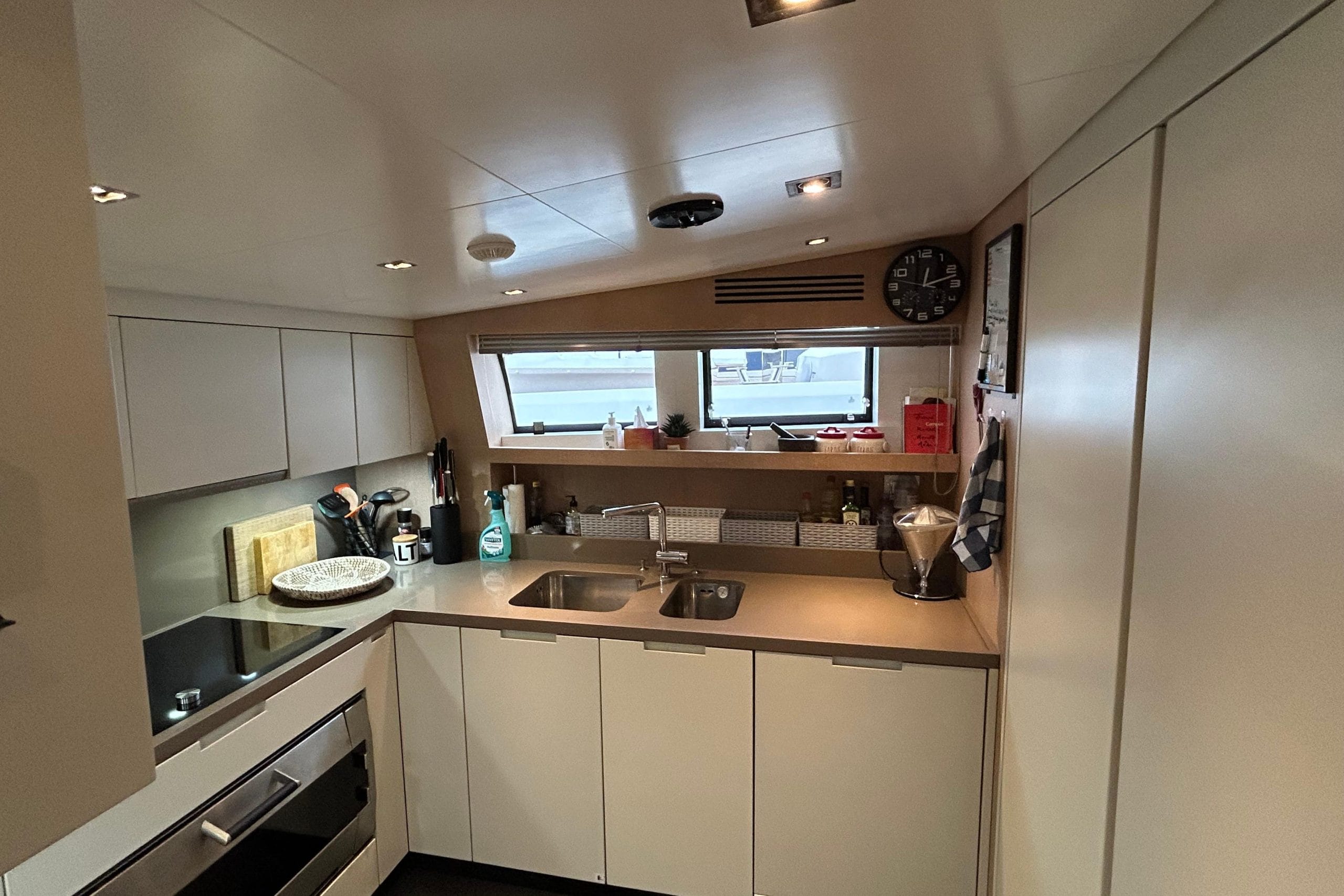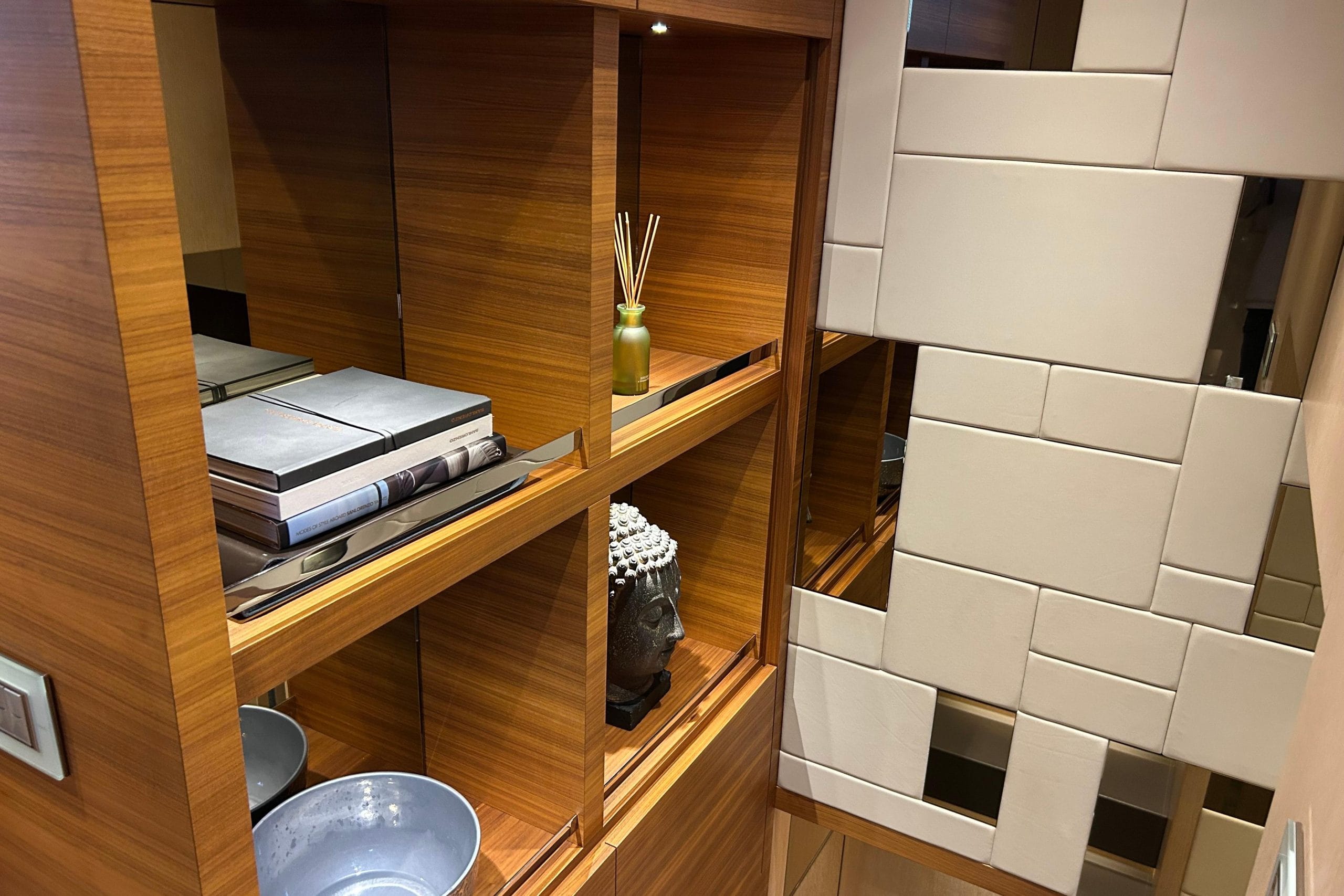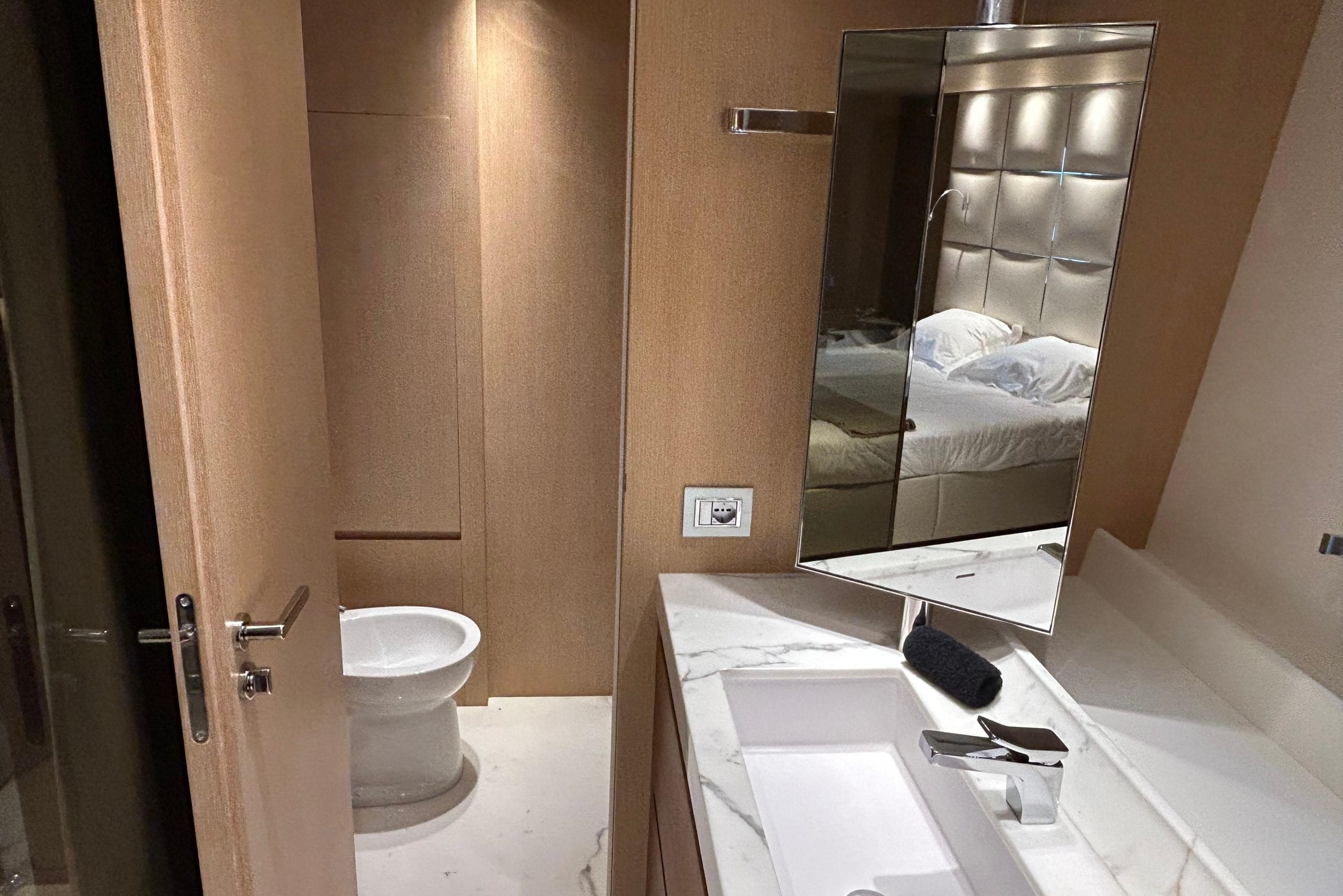 She is fully equipped to an exceptionally high level, including an opening side terrace, fully equipped Boffi flybridge galley, CMC zero-speed and underway stabilizers, and a hydraulic swim platform, delivering outstanding comfort both at anchor and underway.