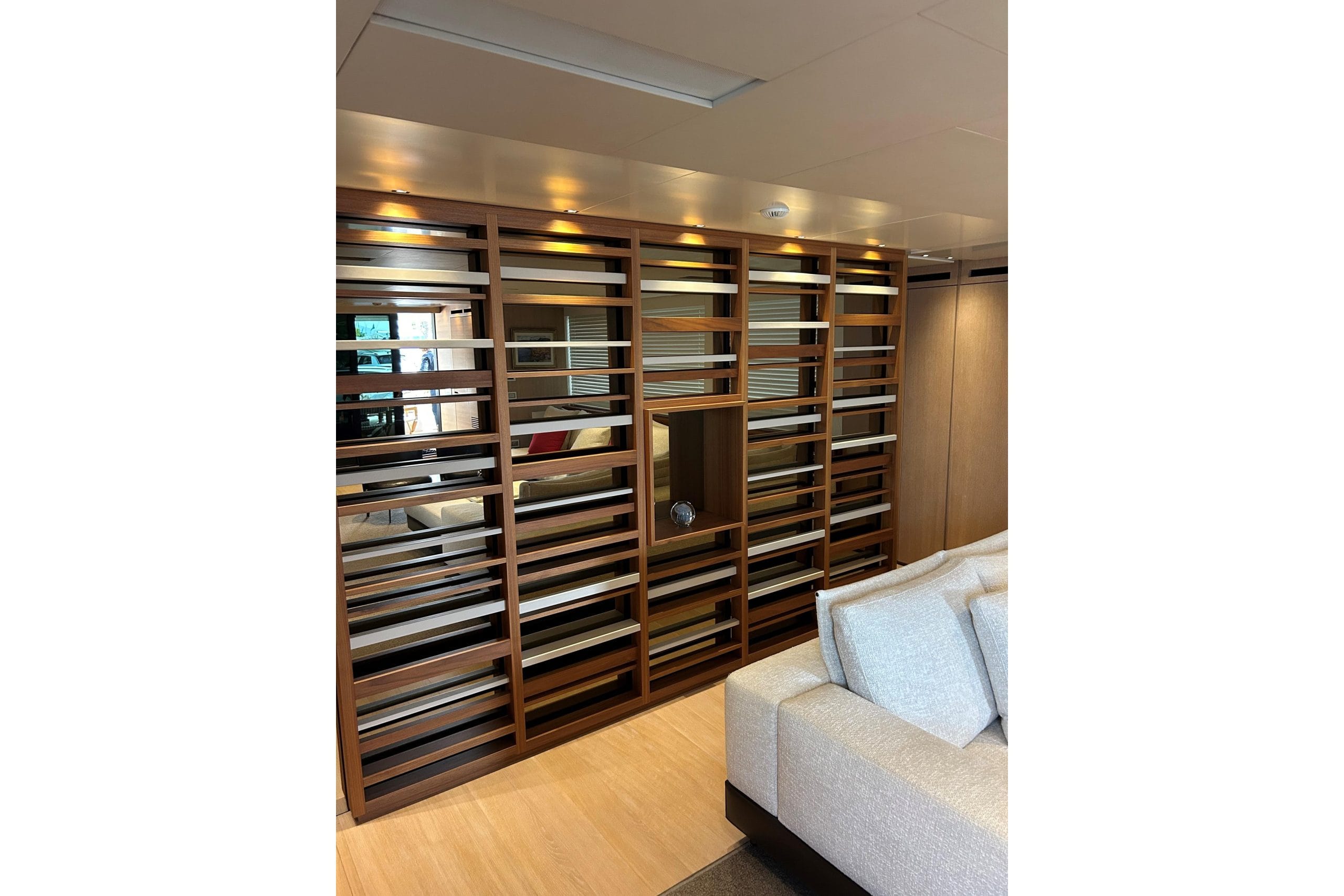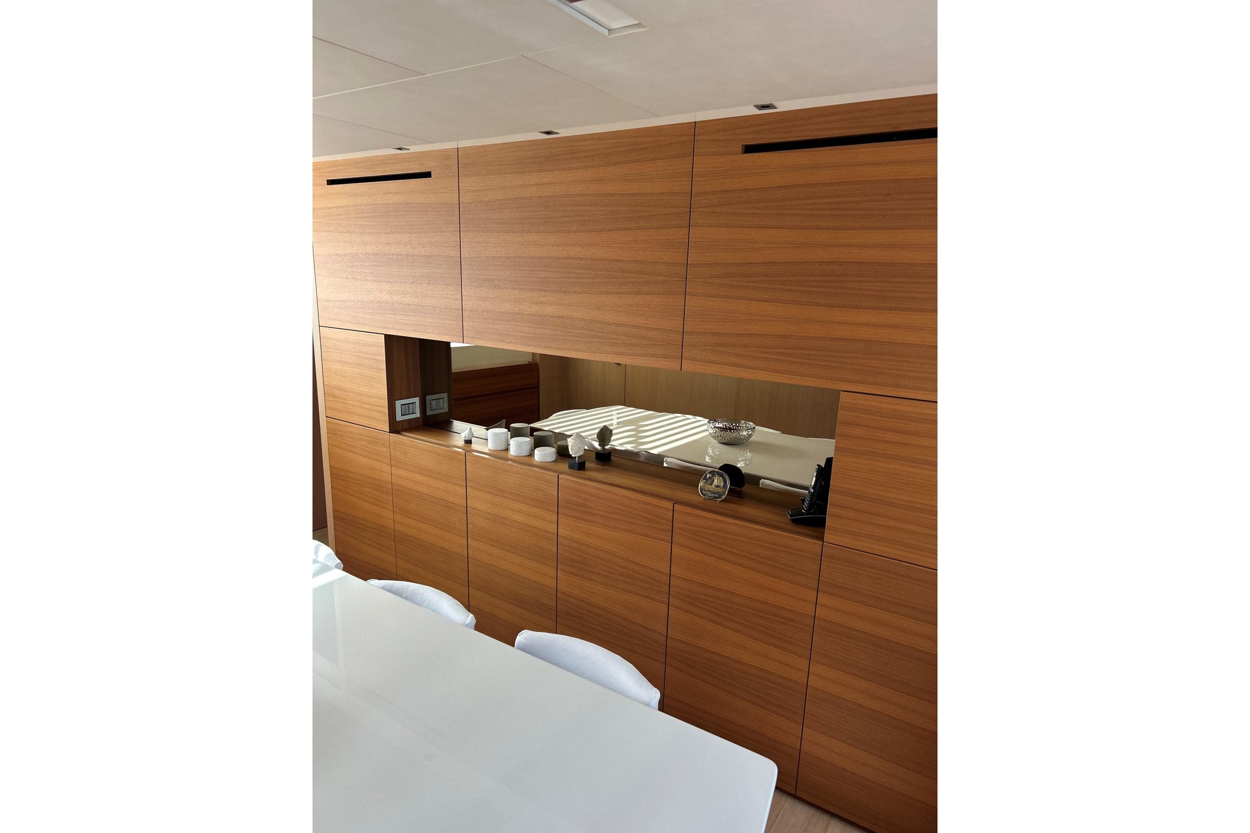 The interior showcases a refined combination of walnut wood and white lacquer, creating a bright, contemporary atmosphere furnished with style and elegance.