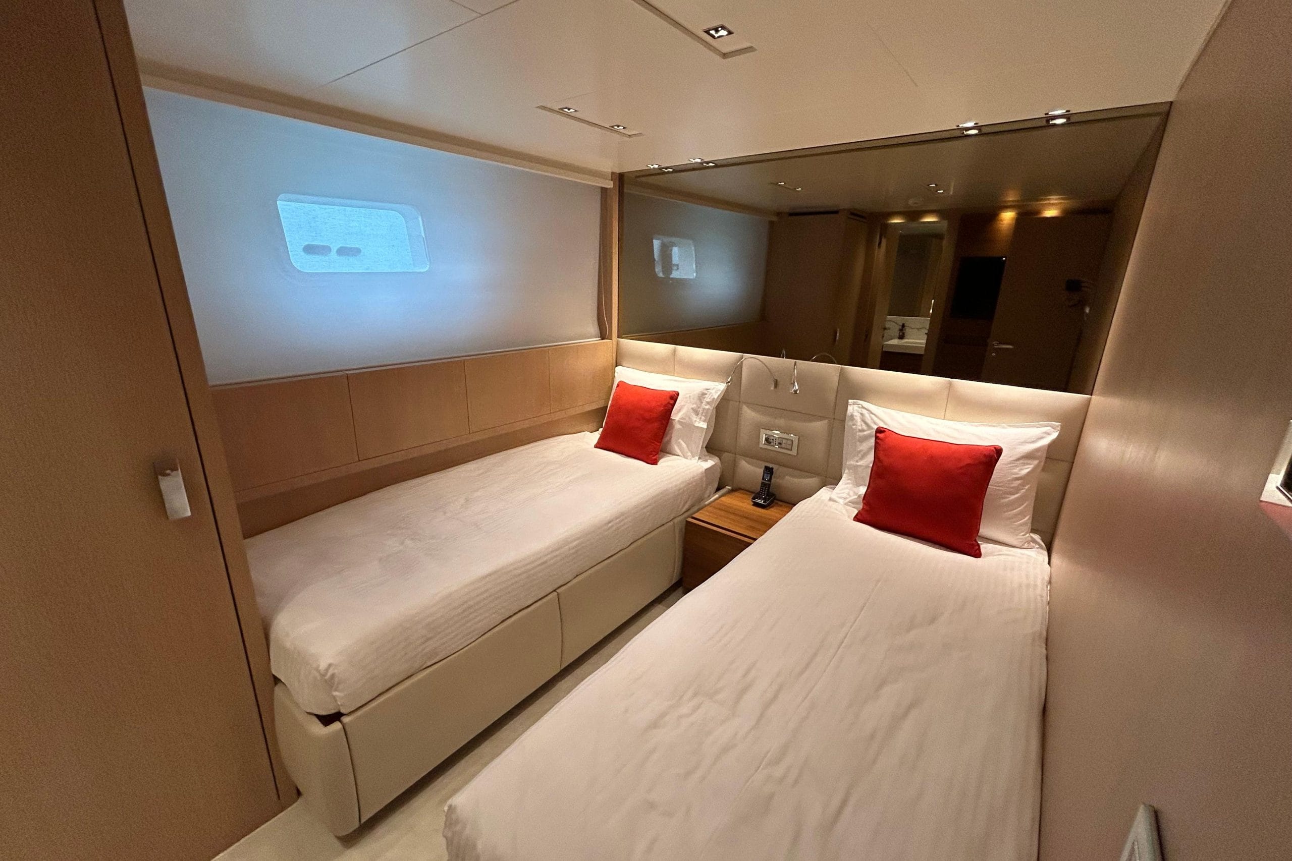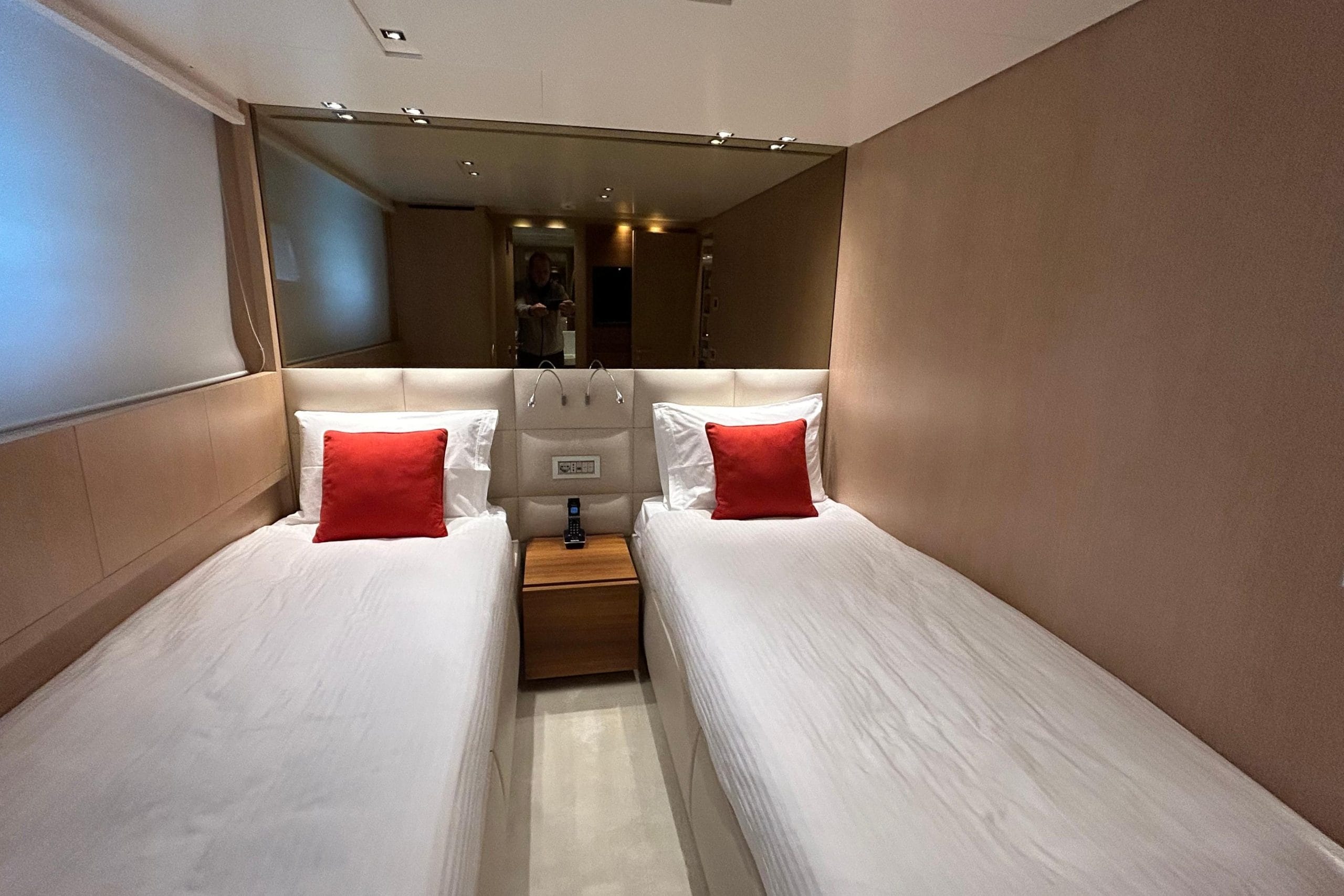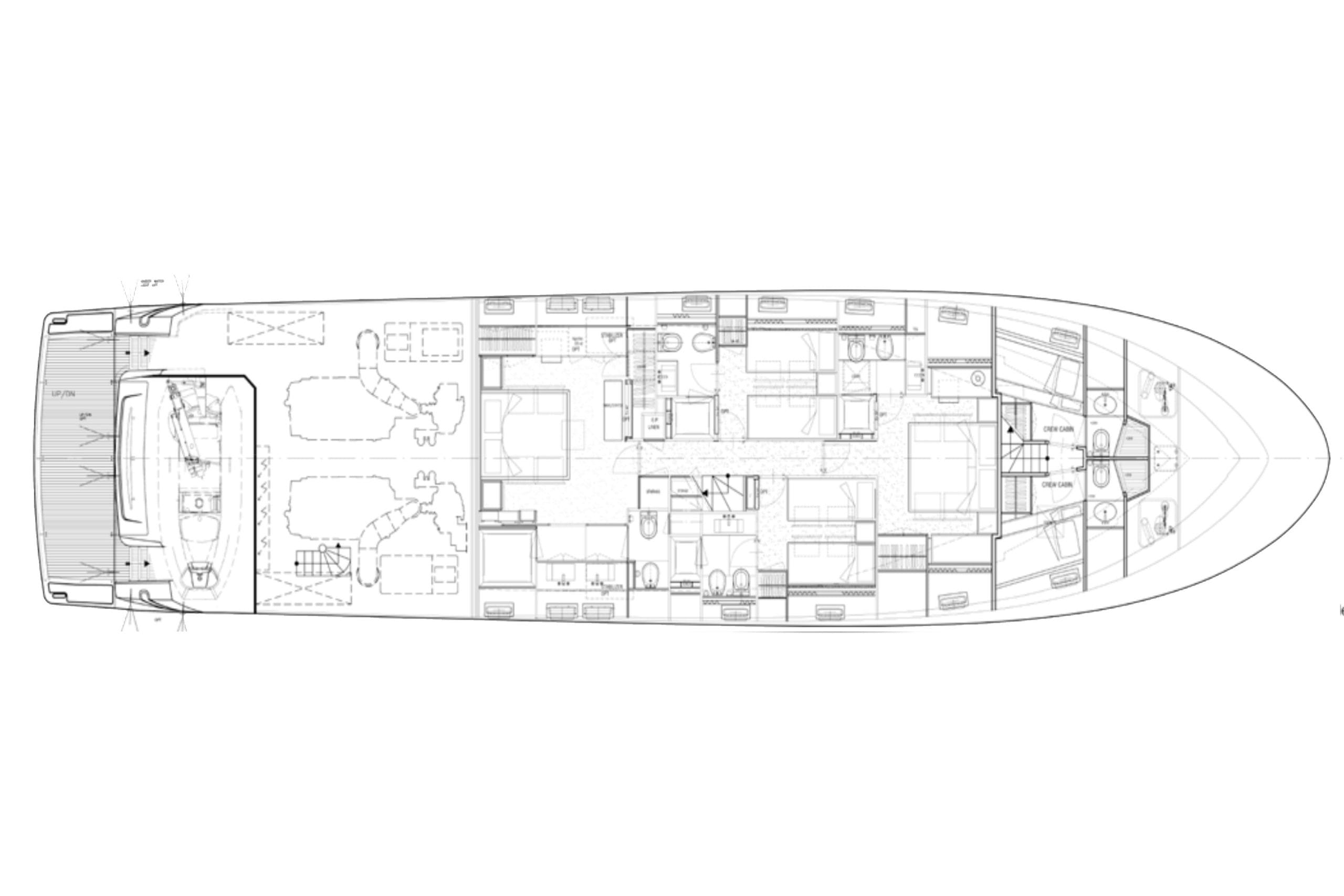 The lower deck is dedicated to guest and crew accommodation. The full-beam owner's double cabin amidships offers a dressing area and private ensuite bathroom. Forward, the VIP double cabin also benefits from an ensuite bathroom, while two twin guest cabins, each with ensuite facilities, complete the guest accommodation. Separate crew quarters comprise two twin crew cabins with two bathrooms, ensuring privacy and efficiency of service.