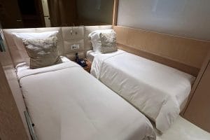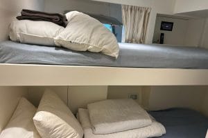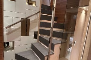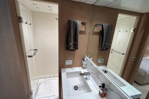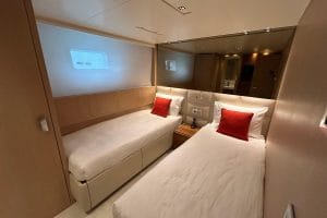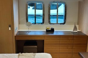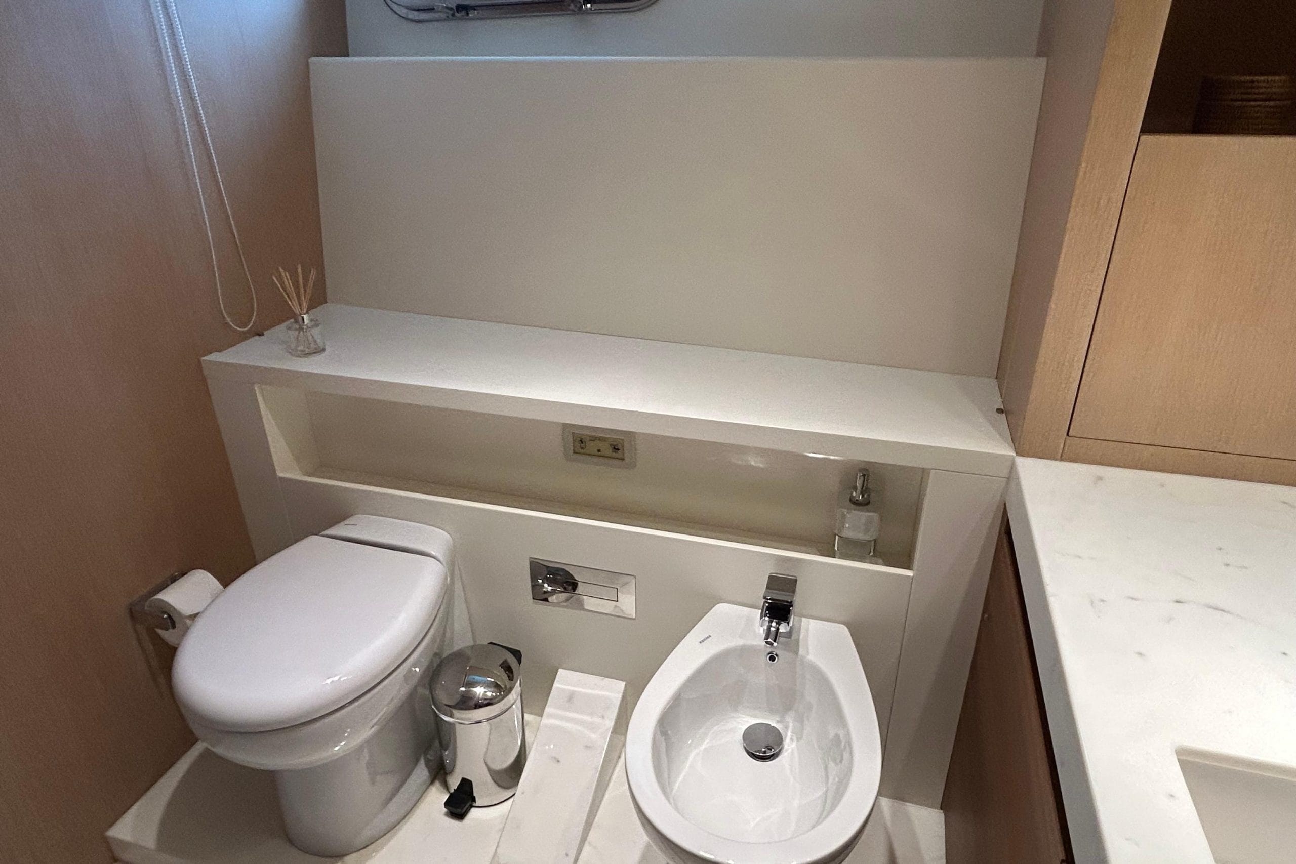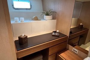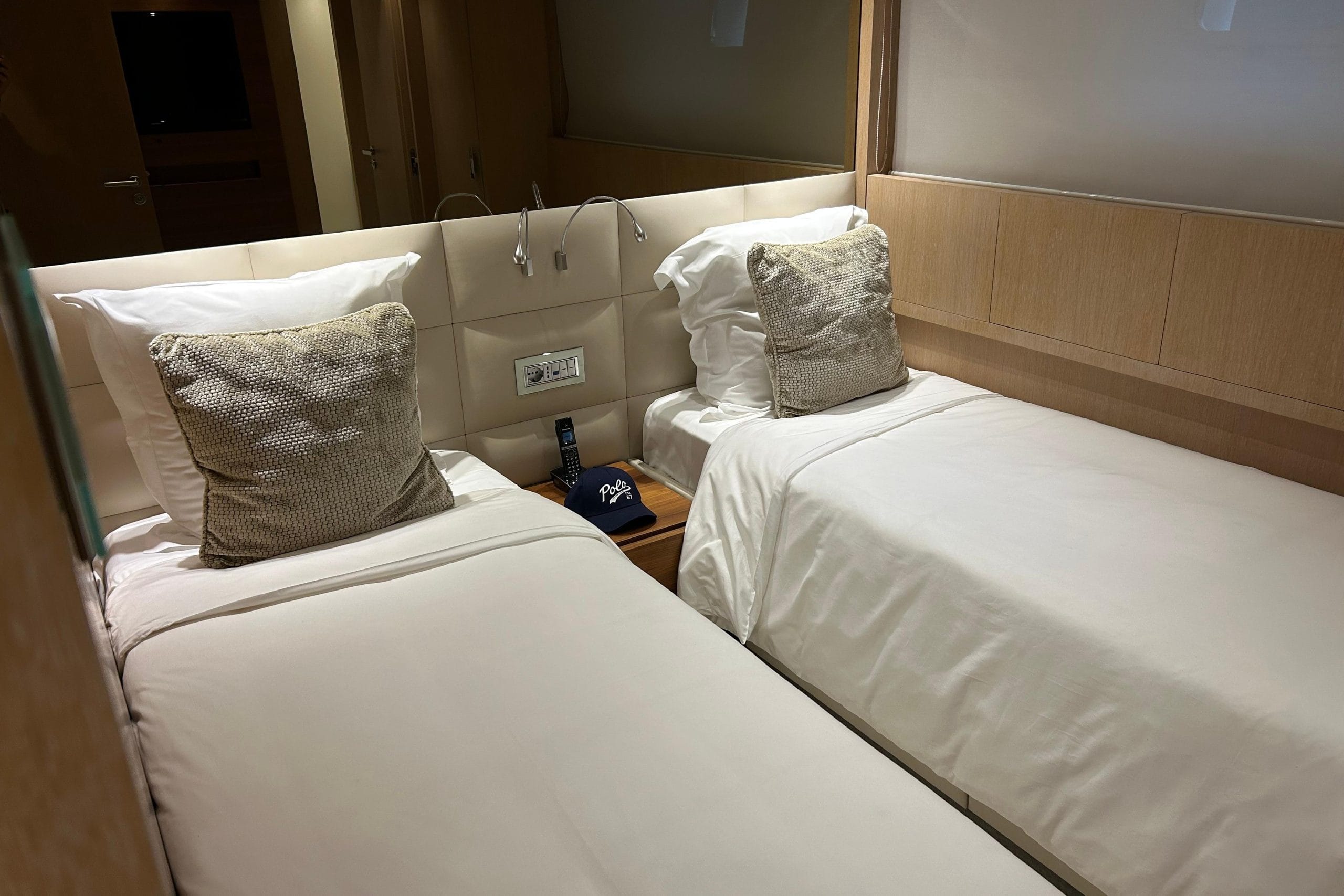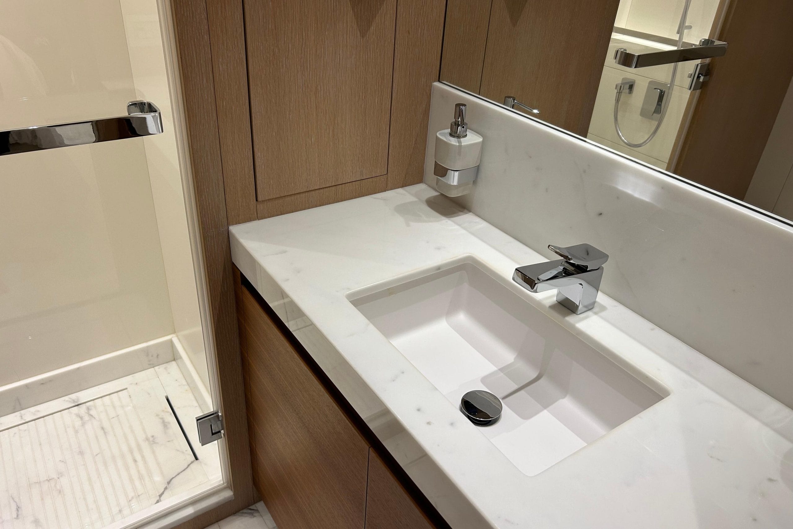 The lower deck is dedicated to guest and crew accommodation. The full-beam owner's double cabin amidships offers a dressing area and private ensuite bathroom. Forward, the VIP double cabin also benefits from an ensuite bathroom, while two twin guest cabins, each with ensuite facilities, complete the guest accommodation. Separate crew quarters comprise two twin crew cabins with two bathrooms, ensuring privacy and efficiency of service.