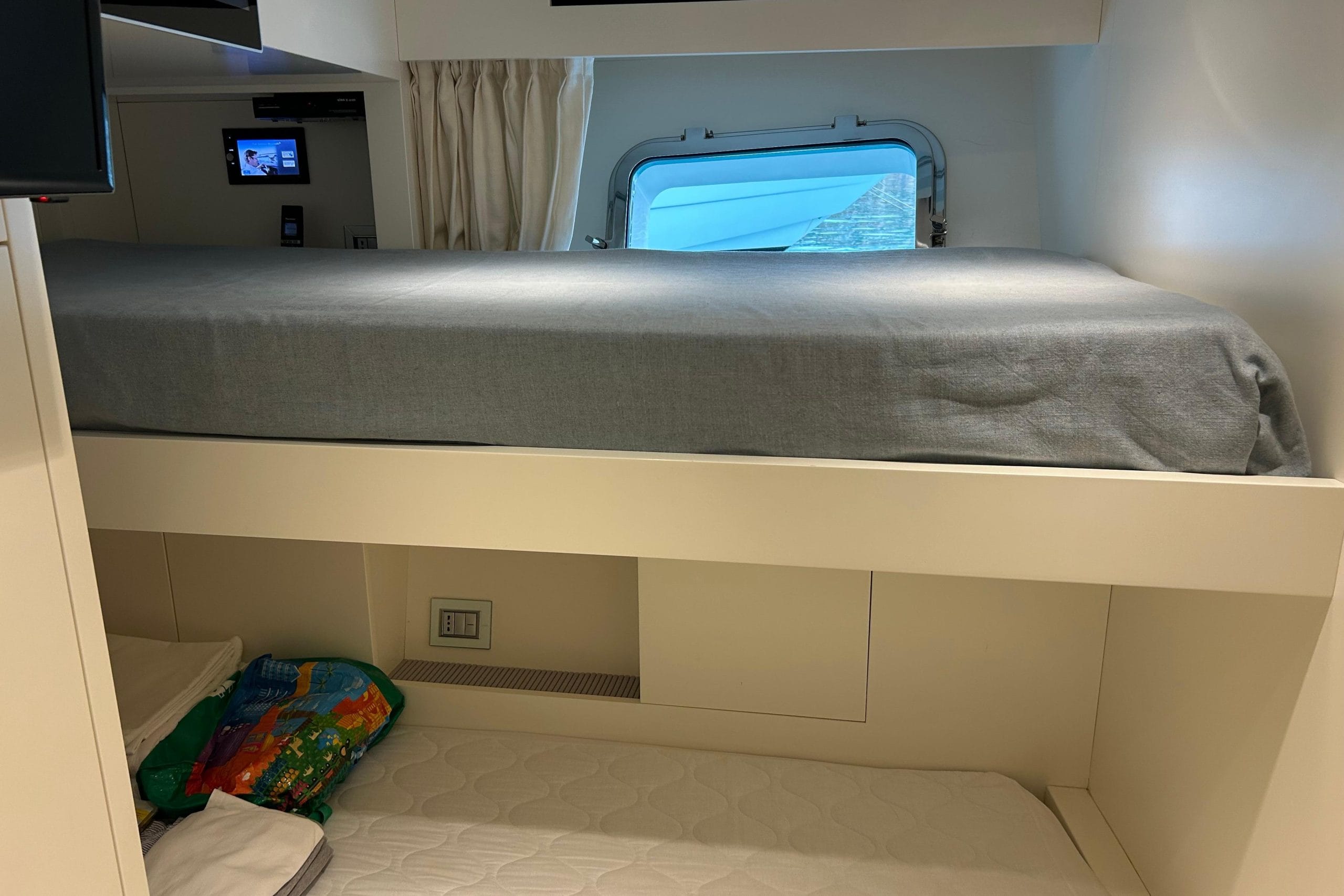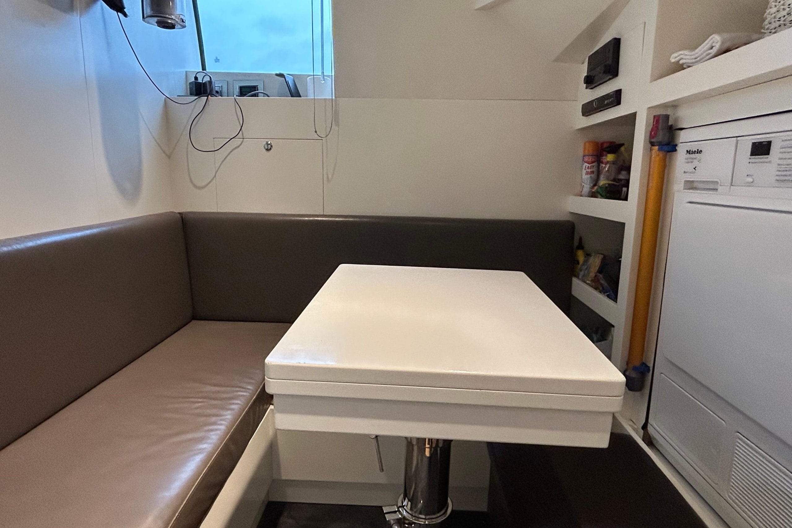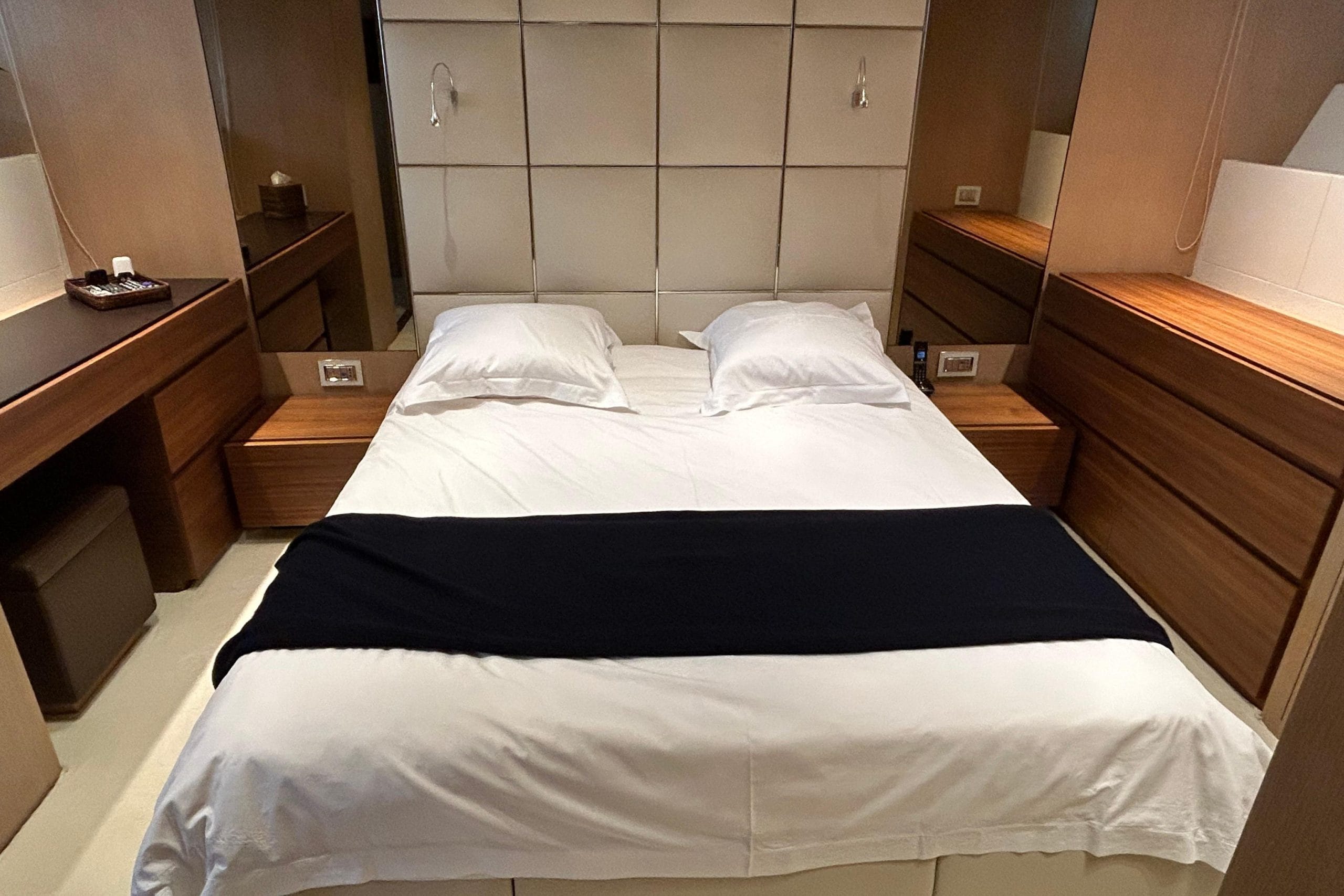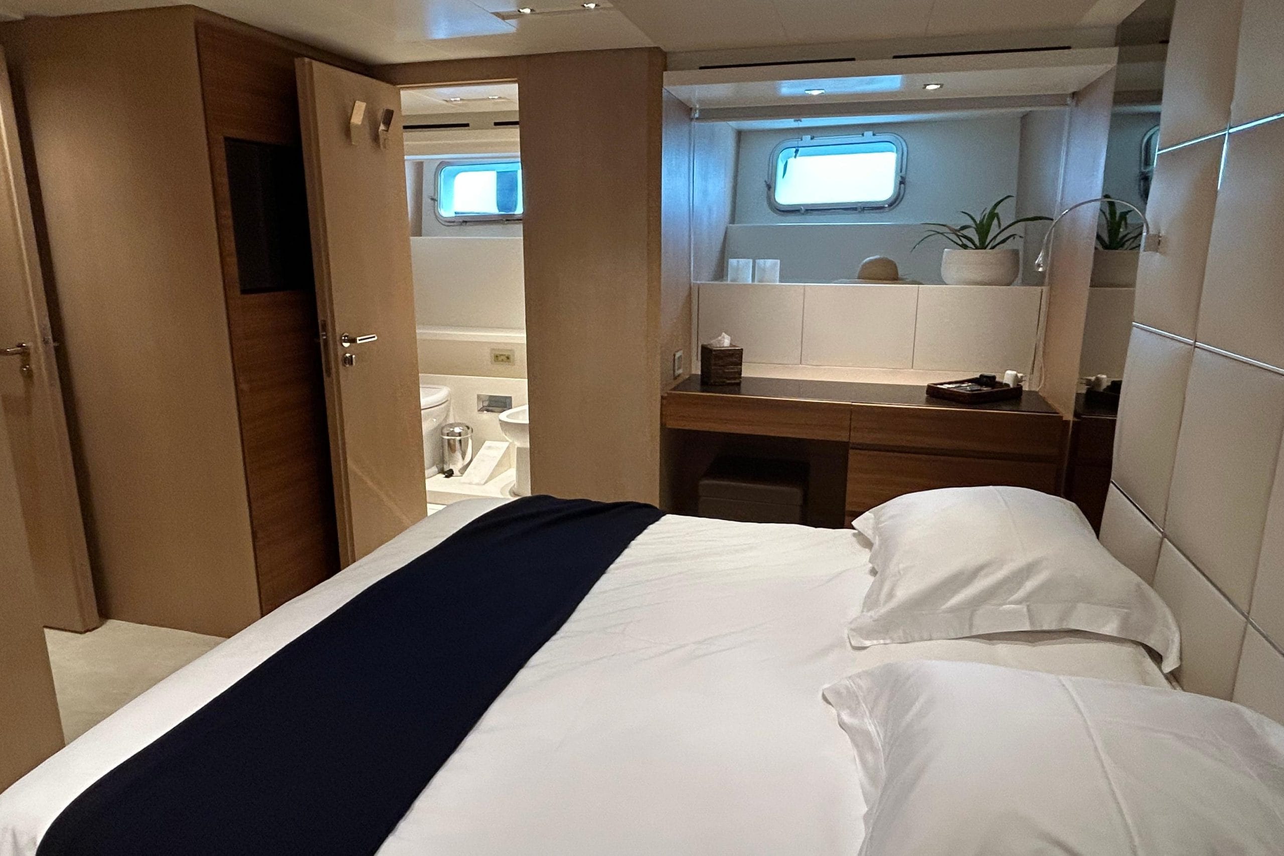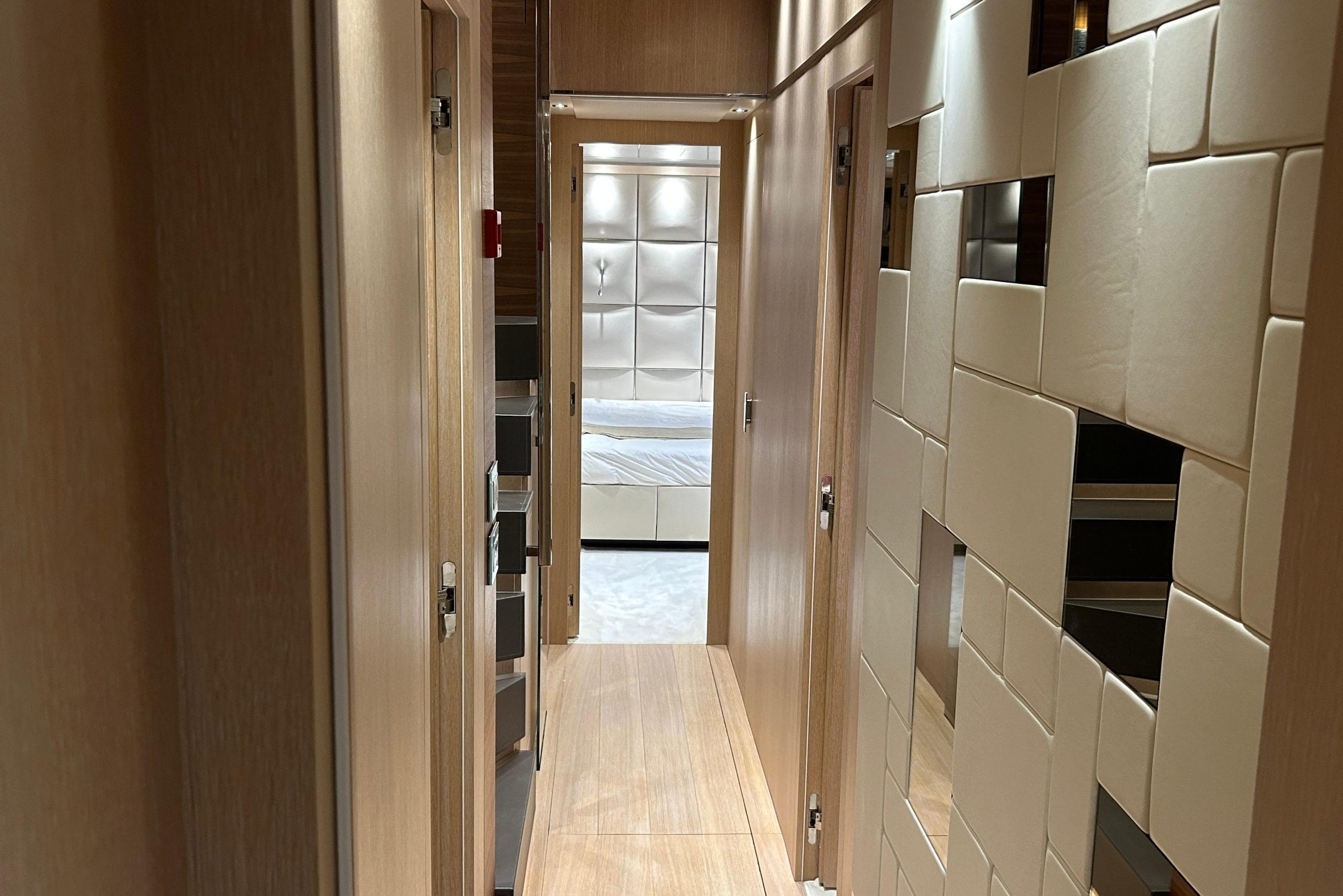 On the main deck, the spacious salon features comfortable L-shaped sofas, integrated storage furniture, and a separate dining area with a large table seating up to eight guests. An opening side terrace balcony to port enhances the sense of space and connection with the sea. This deck also includes a day bathroom, the wheelhouse, and a fully equipped galley with direct access to the crew area. Side access gates on both port and starboard provide easy and safe movement around the yacht.